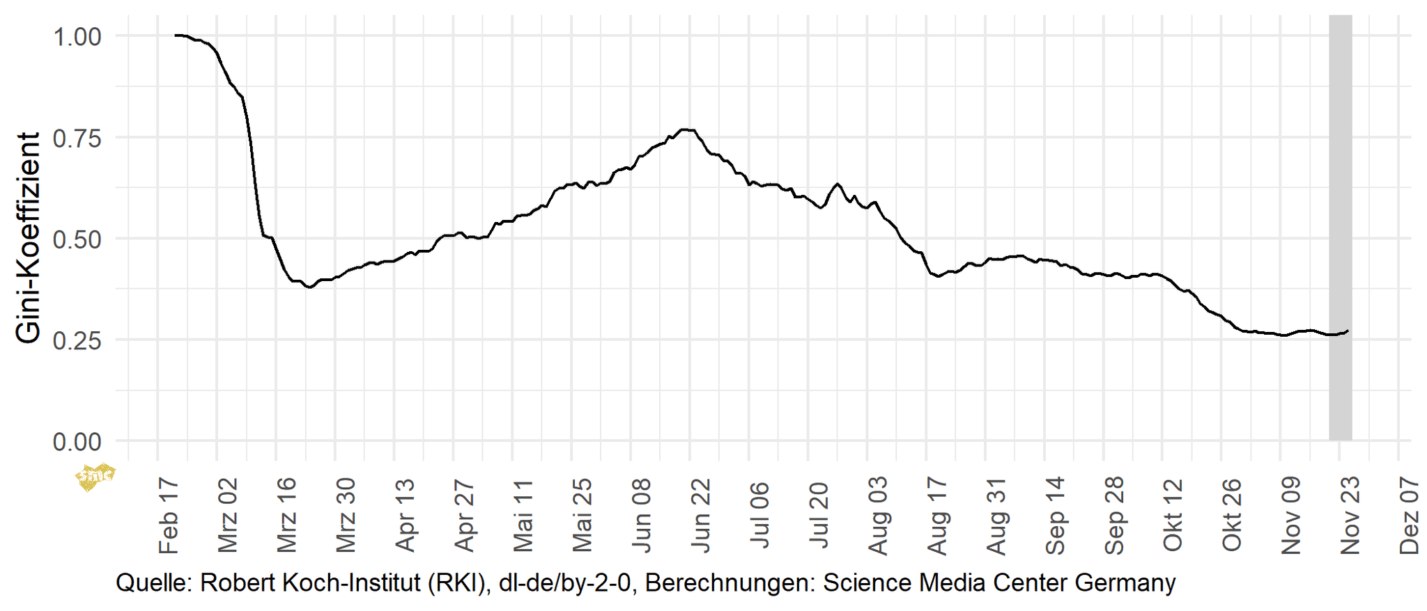 Ende Februar war die Ungleichheit bei den gemeldeten Fällen noch sehr groß, fiel dann aber mit steigender Fallzahl ab, da sich das Virus über Deutschland verteilte. Auch in den Hochzeiten waren die gemeldeten Fälle pro 100 000 Personen nicht gleichmäßig verteilt.