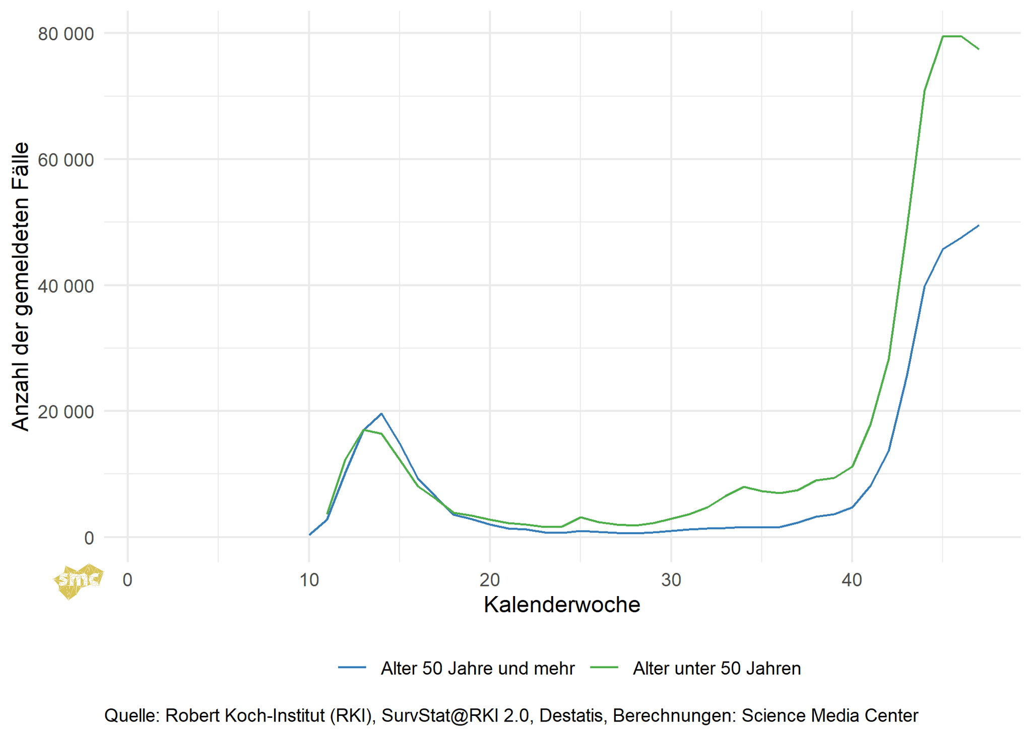 Die Grafik zeigt die gemeldeten Fallzahlen einmal für Personen unter 50 Jahren und einmal ab 50 Jahren. Seit dem Spätsommer ist zu sehen, dass die Fallzahlen in den unteren Altersgruppen zuerst steigen.