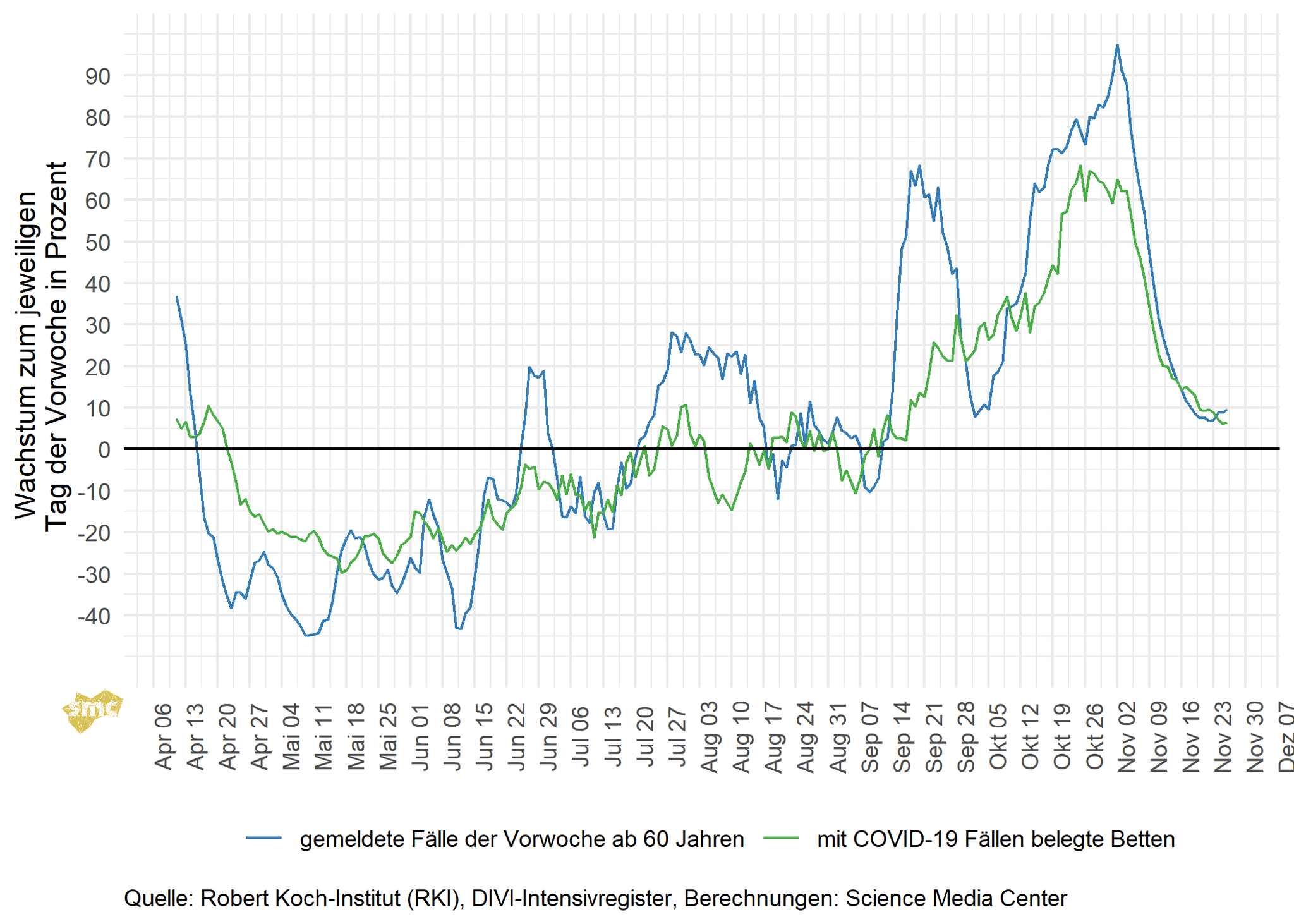 Die Wachstumsrate der mit COVID-19-Fällen belegten Betten ist in den vergangenen Wochen gefallen. Da die Fallzahlen in den Altersgruppen über 60 Jahren wieder schneller wachsen, kann es auch auf den Intensivstationen wieder zu einem beschleunigten Wachstum kommen.