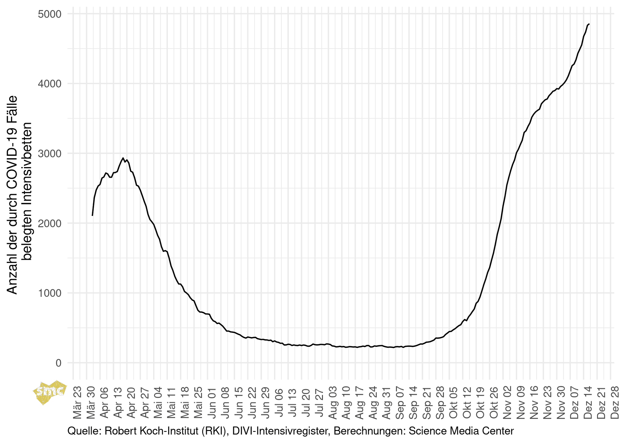 Auf den Intensivstationen ist auch in den nächsten Tagen noch mit einer weiteren Zunahme der durch COVID-19-Fälle belegten Betten zu rechnen. Da diese Zahl den gemeldeten Zahlen nachläuft und zuletzt das Wachstum in den Risikogruppen ab 60 Jahren besonders hoch war, wird die Zahl der so belegten Betten auch in einer Woche, also Weihnachten, noch steigen. Eine Zahl von über 5500 belegten Betten im Laufe der kommenden Woche erscheint aufgrund des aktuellen Wachstums dieser Zahl nicht unplausibel.