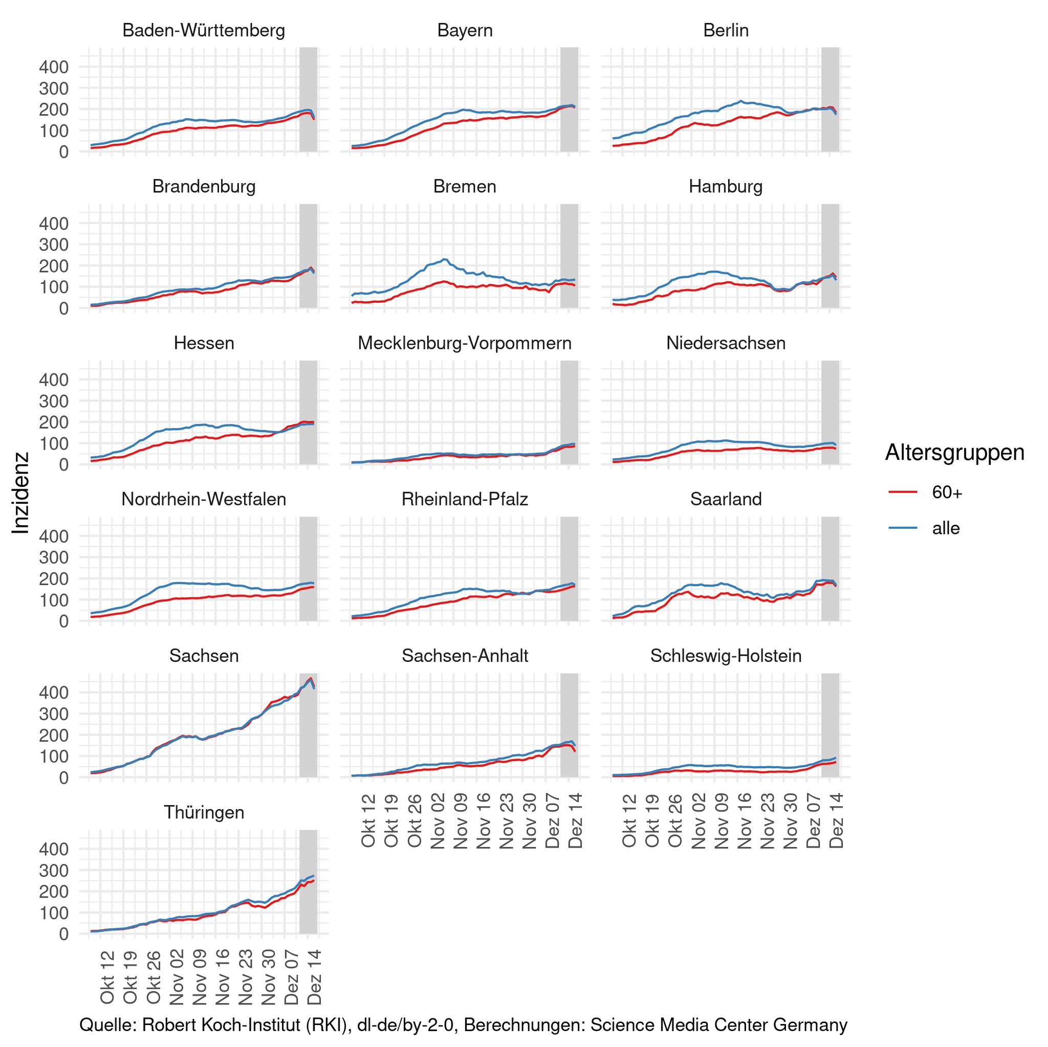 Die Dynamik in den einzelnen Bundesländern ist weiterhin unterschiedlich. In Hessen und Sachsen liegen die Inzidenzen der gemeldeten Fälle für die Altersgruppen ab 60 Jahren inzwischen über denen der Geamtbevölkerung.