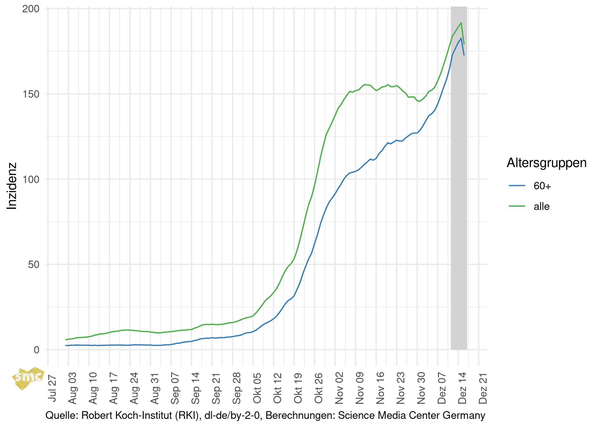 Die Grafik zeigt die Inzidenzen einmal für alle Altersgruppen und einmal ab 60 Jahren. Beide Kurven stiegen zuletzt wieder stark, der Knick im grauen Bereich ist dem Meldeverzug geschuldet.