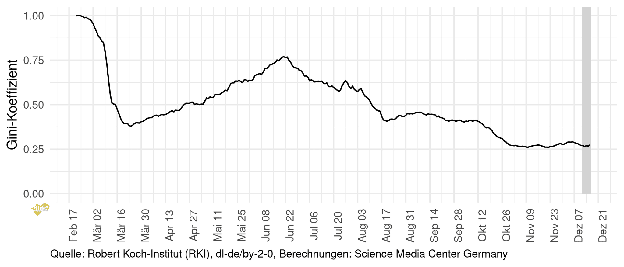 Ende Februar war die Ungleichheit bei den gemeldeten Fällen noch sehr groß, fiel dann aber mit steigender Fallzahl ab, da sich das Virus über Deutschland verteilte. Auch in den Hochzeiten waren die gemeldeten Inzidenzen nicht gleichmäßig verteilt.