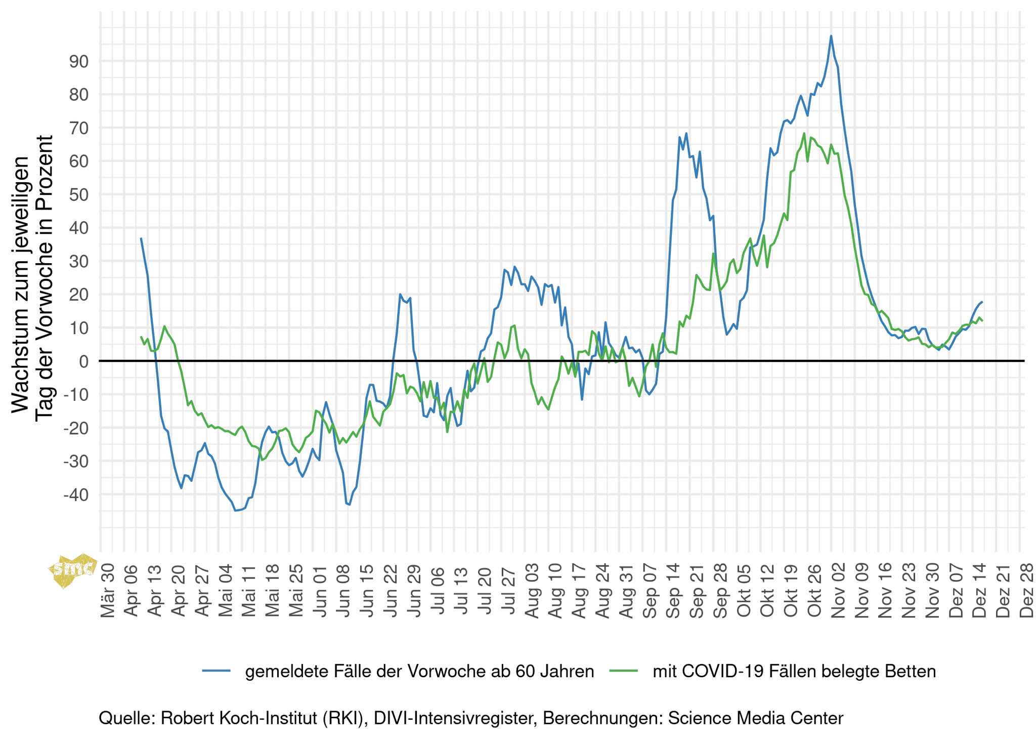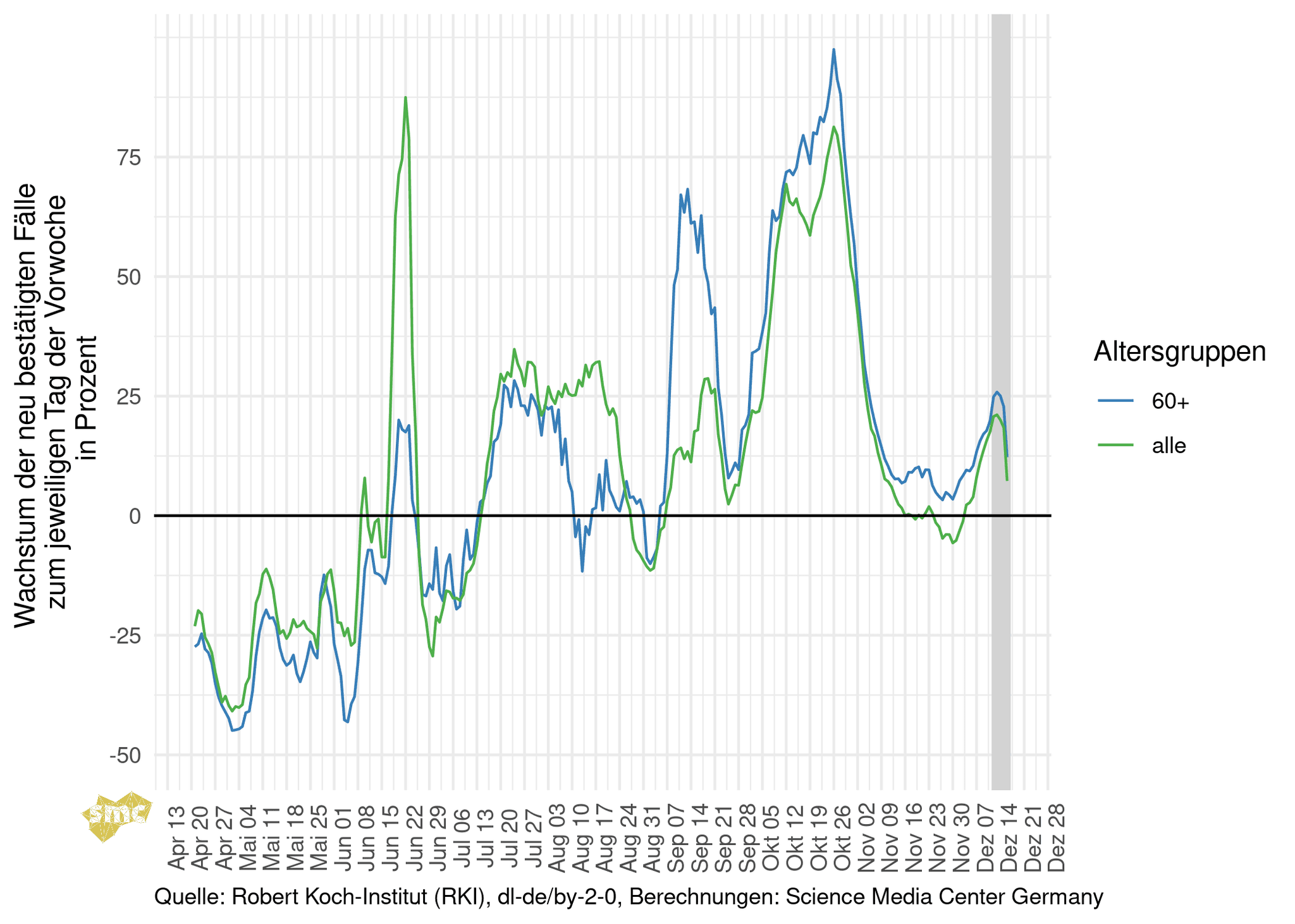 Die Grafik zeigt für jeden Tag das prozentuale Wachstum der geglätteten Fallzahlen im Vergleich zur Vorwoche. Dabei werden einmal alle gemeldeten Fälle berücksichtigt und einmal nur Fälle mit einem Alter von mindestens 60 Jahren. Zur Zeit beschleunigt sich das wöchentliche Wachstum wieder.