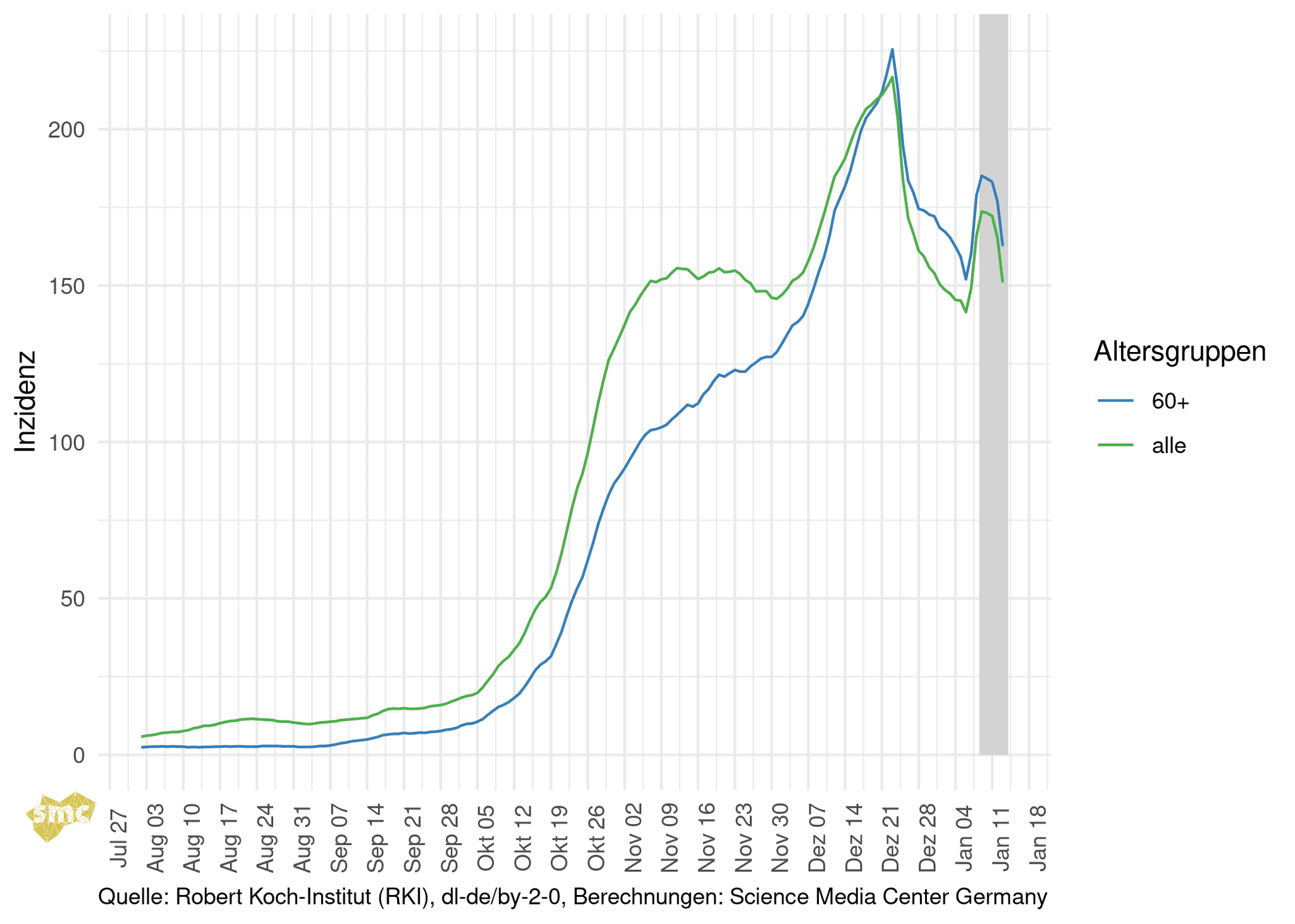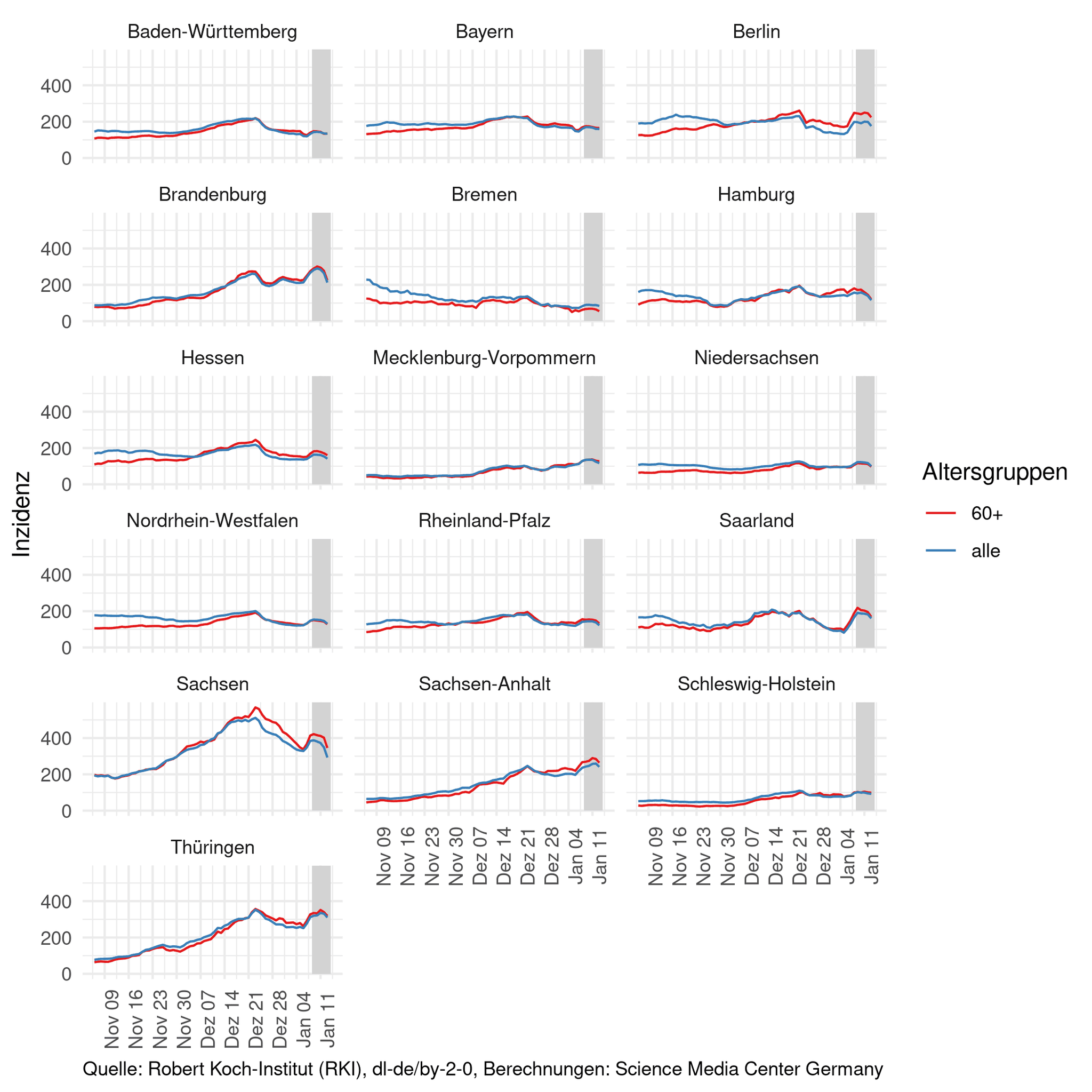 Die Grafik zeigt die Inzidenzen einmal für alle Altersgruppen und einmal ab 60 Jahren. Während der Einfluss der Feiertag inzwischen deutlich abnimmt, ist der aktuelle Trend noch nicht sicher abzuschätzen. Bei den letzten Zeitpunkten ist nur noch der Dreikönigstag im betrachteten Fenster, hier fehlen aber wie üblich noch Nachmeldungen am aktuellen Rand. Bei den sicheren Zahlen (außerhalb des grauen Kastens) werden die Feiertage zum Jahreswechsel noch berücksichtigt.