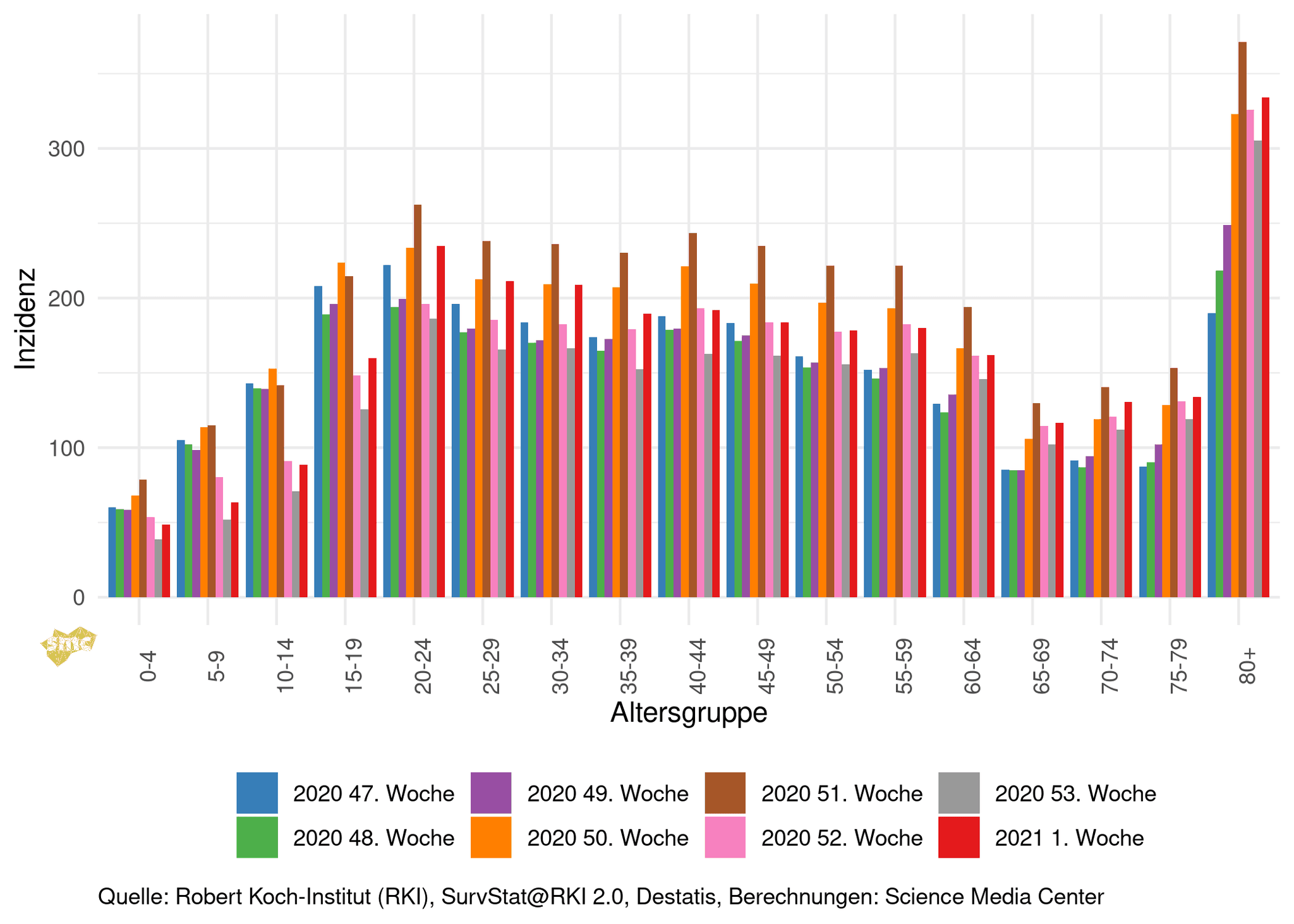 Die steigenden Inzidenzen in allen Altersgruppen sind auf Grund der Normalisierung nach den Feiertagen erwartbar.