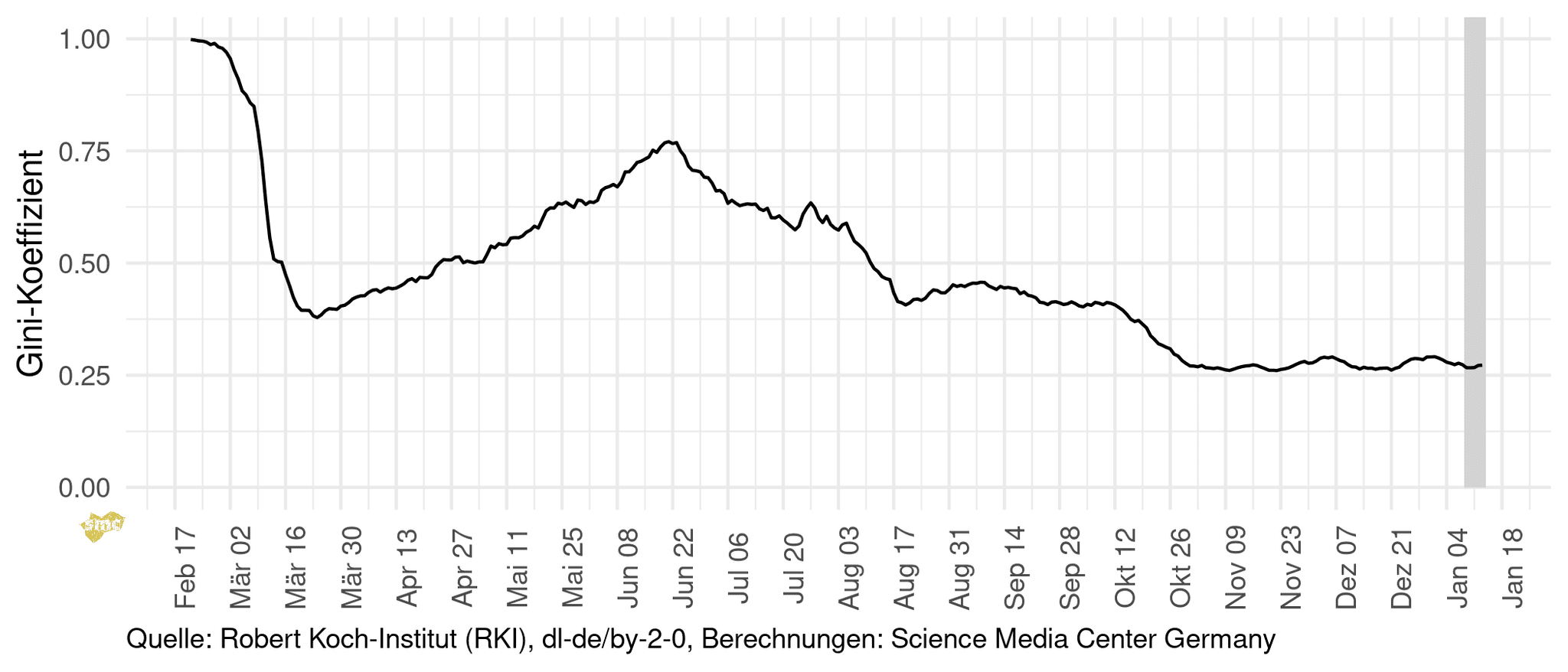 Ende Februar war die Ungleichheit bei den gemeldeten Fällen noch sehr groß, fiel dann aber mit steigender Fallzahl ab, da sich das Virus über Deutschland verteilte. Auch in den Hochzeiten waren die gemeldeten Inzidenzen nicht gleichmäßig verteilt.