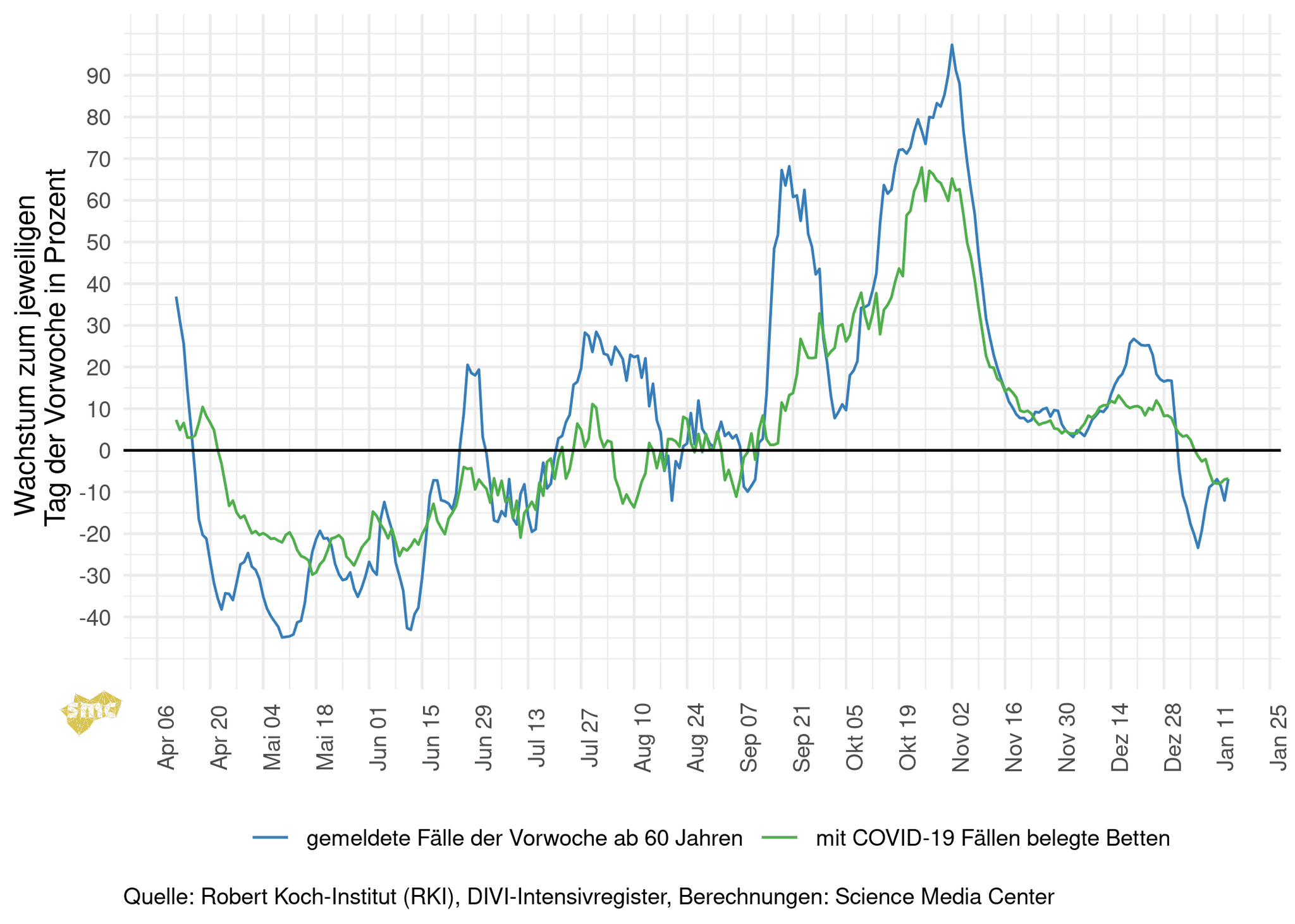 Die Wachstumsrate der mit COVID-19-Fällen belegten Betten ist inzwischen negativ, die Zahl der mit COVID-19-Fällen belegten Betten geht also zurück. Durch die Verschiebung der gemeldeten Fälle in der Grafik ist der sichtbare starke Rückgang den Weihnachtsfeiertagen und dem Jahreswechsel geschuldet.