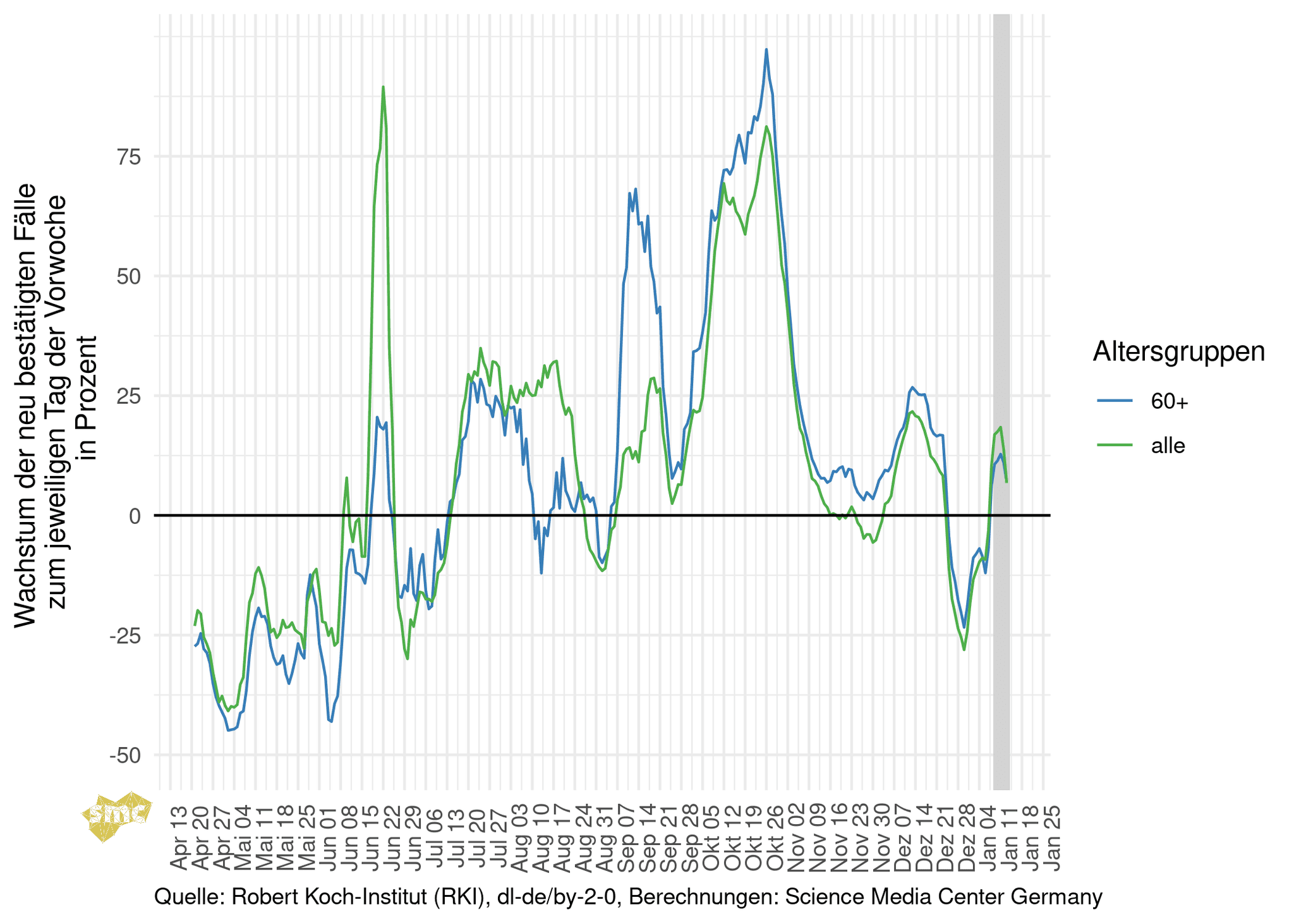 Die Grafik zeigt für jeden Tag das prozentuale Wachstum der geglätteten Fallzahlen im Vergleich zur Vorwoche. Dabei werden einmal alle gemeldeten Fälle berücksichtigt und einmal nur Fälle mit einem Alter von mindestens 60 Jahren. Das aktuelle positive Wachstum ist den verminderten Meldungen zum Jahreswechsel geschuldet. Das Wachstum wird erst im Laufe der kommenden Woche wieder besser interpretierbar sein.
