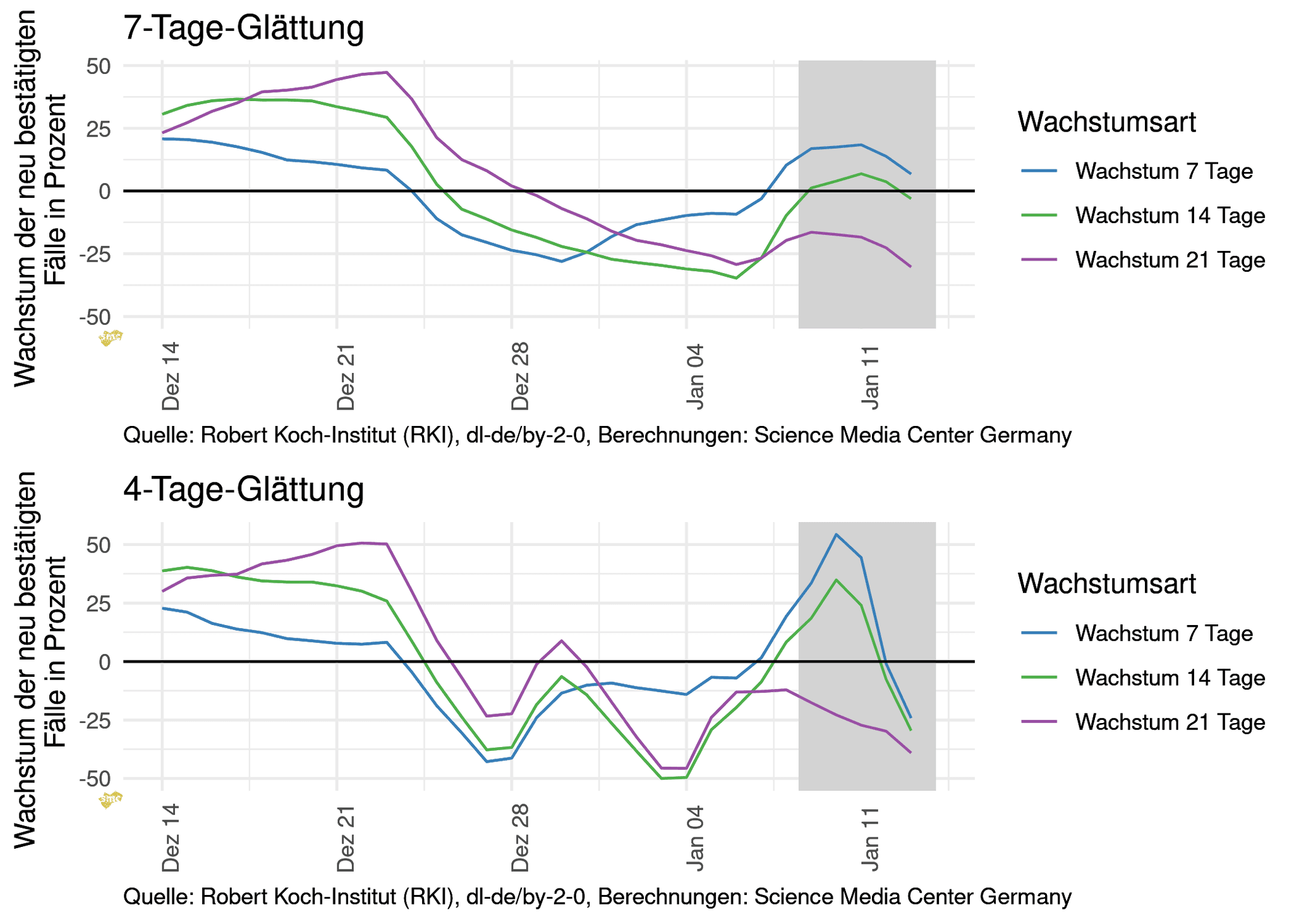 Gerade der aktuelle Trend ist noch schwer einzuschätzen, da die Größe des Wachstums auf dem Vergleich zur Vorwoche beruht und wegen des Jahreswechsels und des Dreikönigstags noch nicht sicher durchgeführt werden kann. Im Situationsbericht der vergangenen Woche wurden an dieser Stelle bereits mehrere Varianten des Wachstums betrachtet, um zumindest eine grobe Abschätzung zu erhalten. Wie erwartet ist das 7-Tage-Wachstum aktuell positiv, da hier mit den Meldezahlen um Neujahr verglichen wird. Der Vergleich mit der Zeit vor Weihnachten (21 Tage) zeigt weiterhin ein deutliches negatives Wachstum.