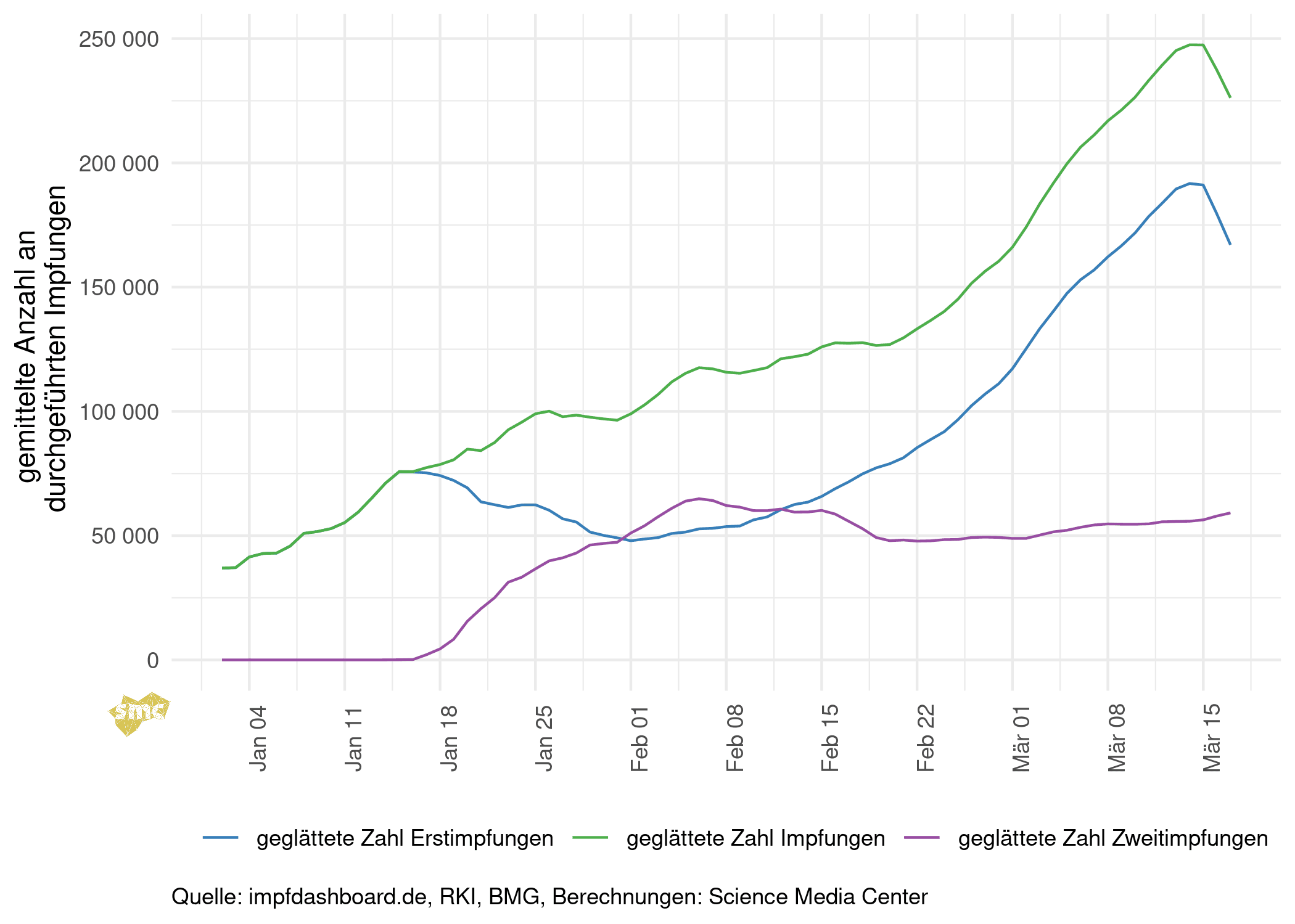 Da immer mehr Impfstoff verfügbar ist, kann sich auch das Impftempo beschleunigen. Die Grafik zeigt den über sieben Tage geglätteten Verlauf der täglichen Impfungen insgesamt und nach Erst- beziehungsweise Zweitimpfung getrennt. Deutlich zu sehen ist das zeitlich verzögerte Wachstum der Erst- und Zweitimpfungen. Aufgrund der limitierten Anzahl an Impfstoff musste im Januar sogar die Zahl der Erstimpfungen reduziert werden, um genug Dosen für die Zweitimpfungen bereit halten zu können. Durch die Aussetzung der Impfungen mit dem AstraZeneca-Impfstoff geht die geglättete Zahl der durchgeführten Impfungen zum ersten Mal deutlich zurück.