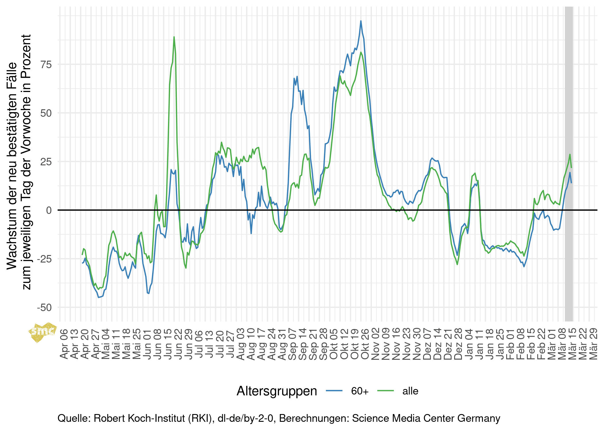 Die Grafik zeigt für jeden Tag das prozentuale Wachstum der geglätteten Fallzahlen im Vergleich zur Vorwoche. Dabei werden einmal alle gemeldeten Fälle berücksichtigt und einmal nur Fälle mit einem Alter von mindestens 60 Jahren. Es werden wieder Wachstumsraten von über 20 Prozent erreicht. Auch in den oberen Altersklassen steigt das Wachstum der Fallzahlen schnell an.