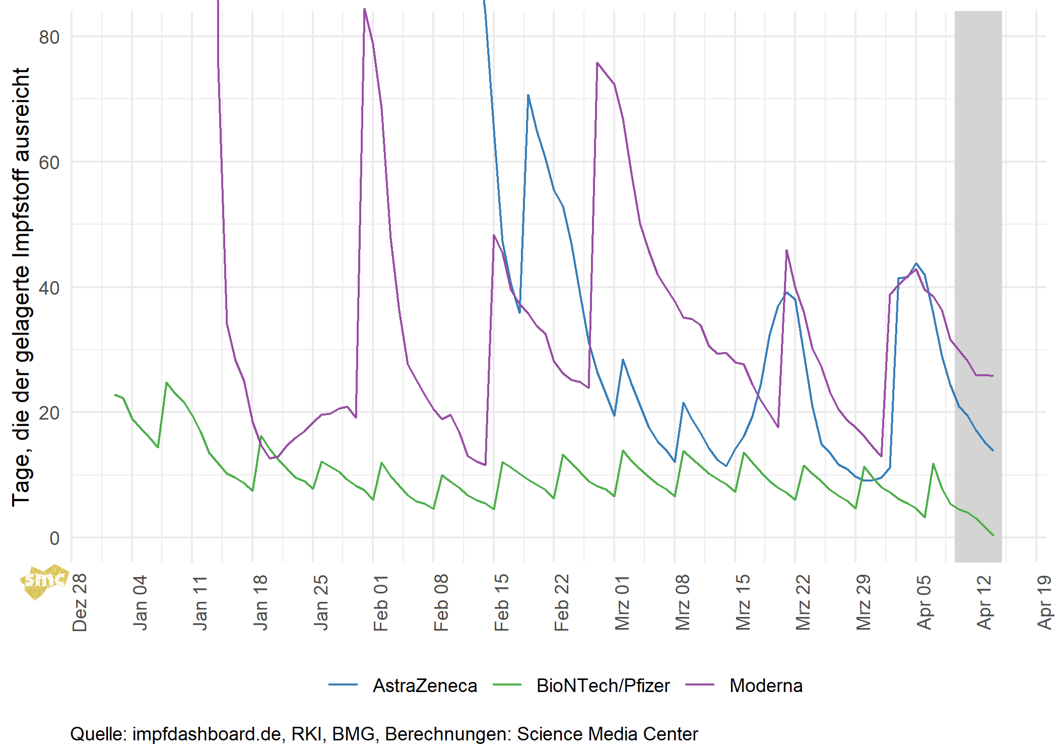 Da sowohl die Zahl der täglich verimpften Dosen als auch die Größe der Impfstofflieferungen wächst, darf bei der Frage, ob zu viel Impfstoff gelagert wird, nicht nur auf die absoluten Zahlen geachtet werden. In der folgenden Grafik wird der noch nicht verimpfte Impfstoff mit den der aktuellen über sieben Tage geglätteten Impfgeschwindigkeit verglichen. Die Grafik gibt also an, wie viele Tage der gelagerte Impfstoff ohne Nachschub ausreichen würde.
