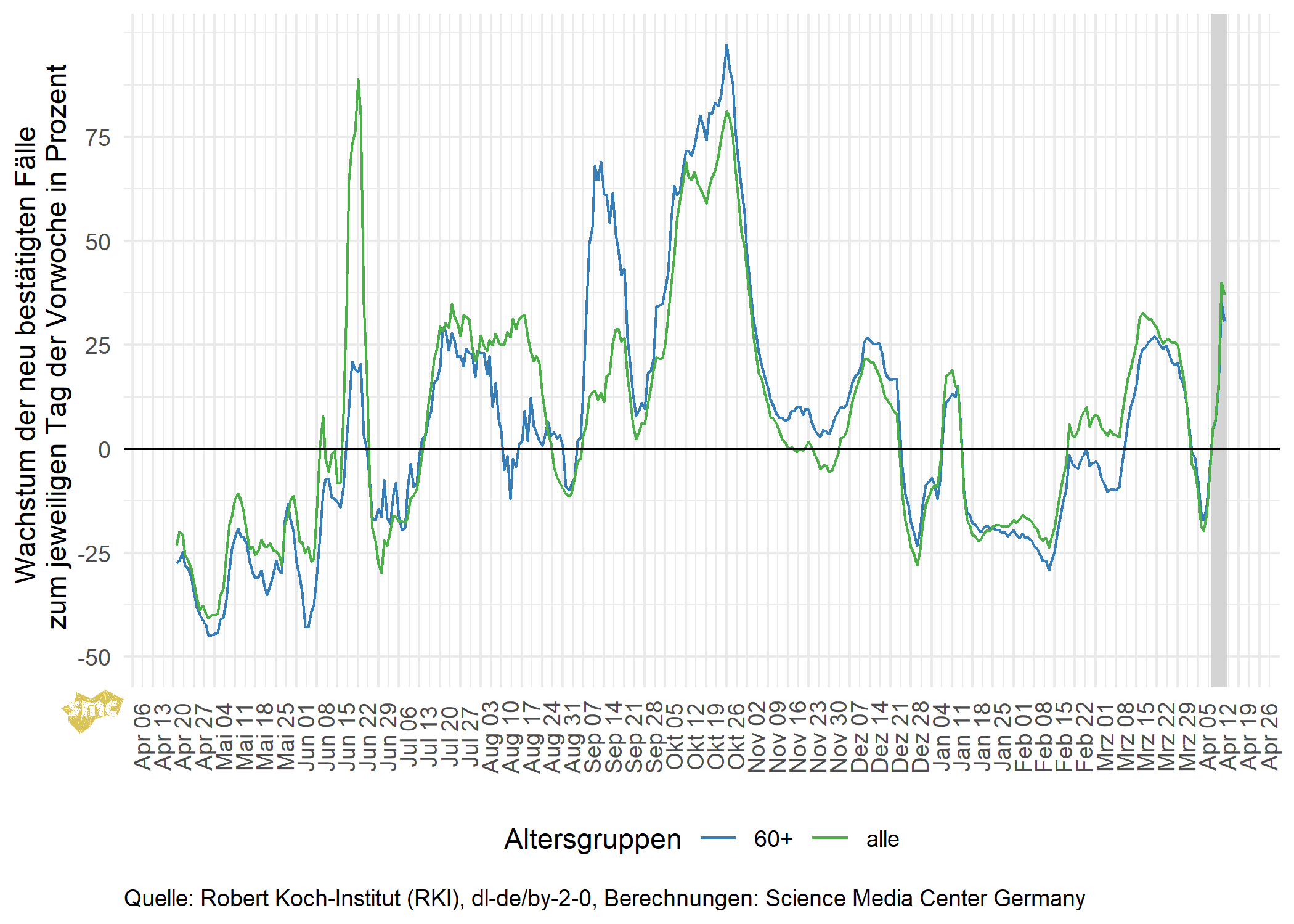 Die Grafik zeigt für jeden Tag das prozentuale Wachstum der geglätteten Fallzahlen im Vergleich zur Vorwoche. Dabei werden einmal alle gemeldeten Fälle berücksichtigt und einmal nur Fälle mit einem Alter von mindestens 60 Jahren. Im Gegensatz zur Höhe der Inzidenz wird das Wachstum noch stark von den geringen Meldezahlen um Ostern beeinflusst. Erst in der kommenden Woche lässt sich das aktuelle Wachstum besser einschätzen. Der Vergleich einzelner Meldedaten mit einem Wert von vor Ostern suggeriert aktuell ein wöchentliches Wachstum um zehn Prozent.