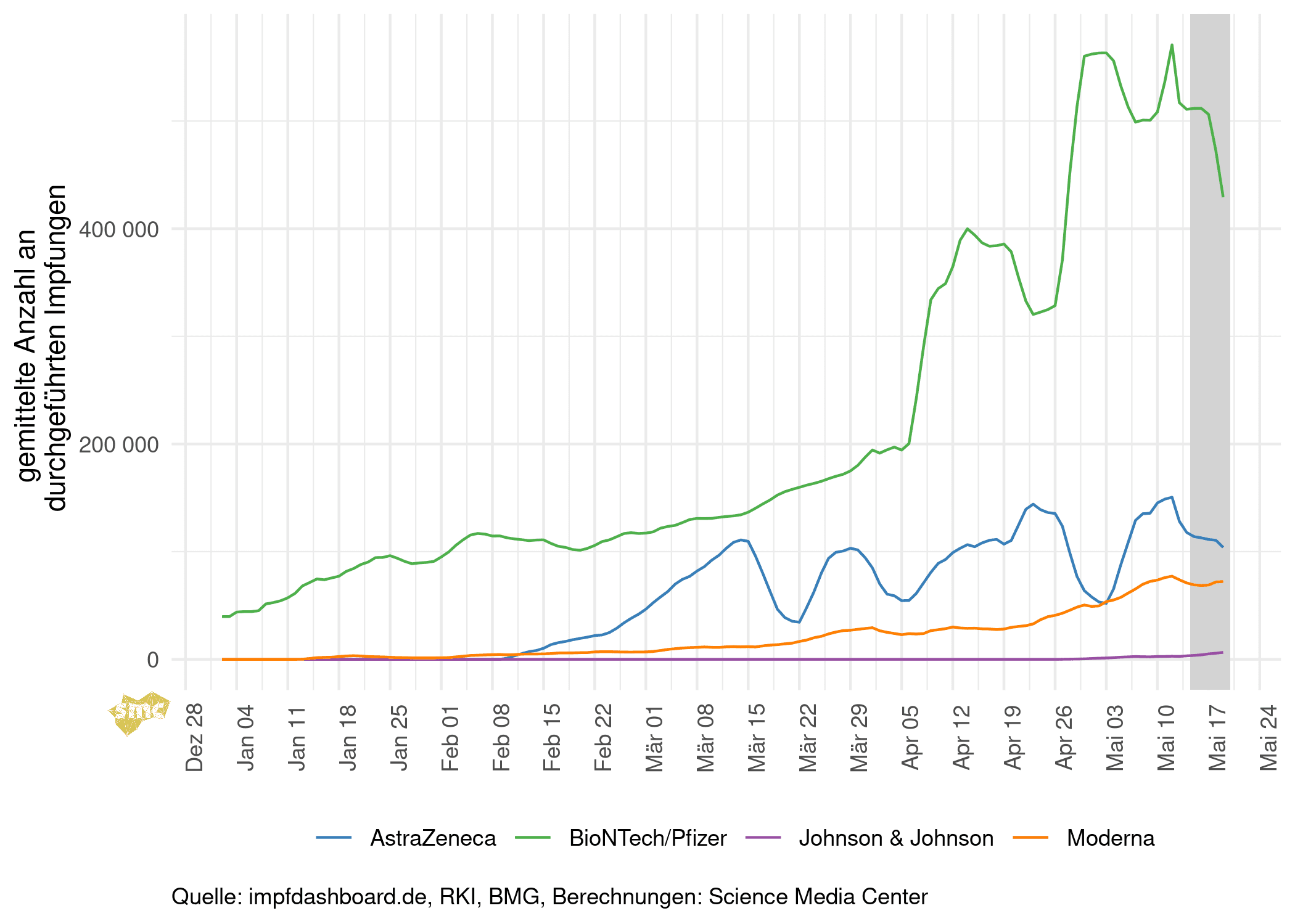Vergleicht man die bereits gelieferten und die im Mai angekündigten Lieferungen der Vektorimpfstoffe mit den angekündigten Liefermengen für das zweite Quartal, so müssten bei AstraZeneca im Juni etwa 8 Millionen Dosen geliefert werden, und bei Johnson & Johnson etwa 9 Millionen Dosen. Dies wäre eine extreme Steigerung zu den im Mai gelieferten Dosen. Es erscheint daher unwahrscheinlich, dass diese beiden Impfstoffe in angekündigtem Umfang zur Verfügung stehen werden. Die Hersteller der mRNA-Impfstoffe liegen derweil innerhalb ihrer Ankündigungen.