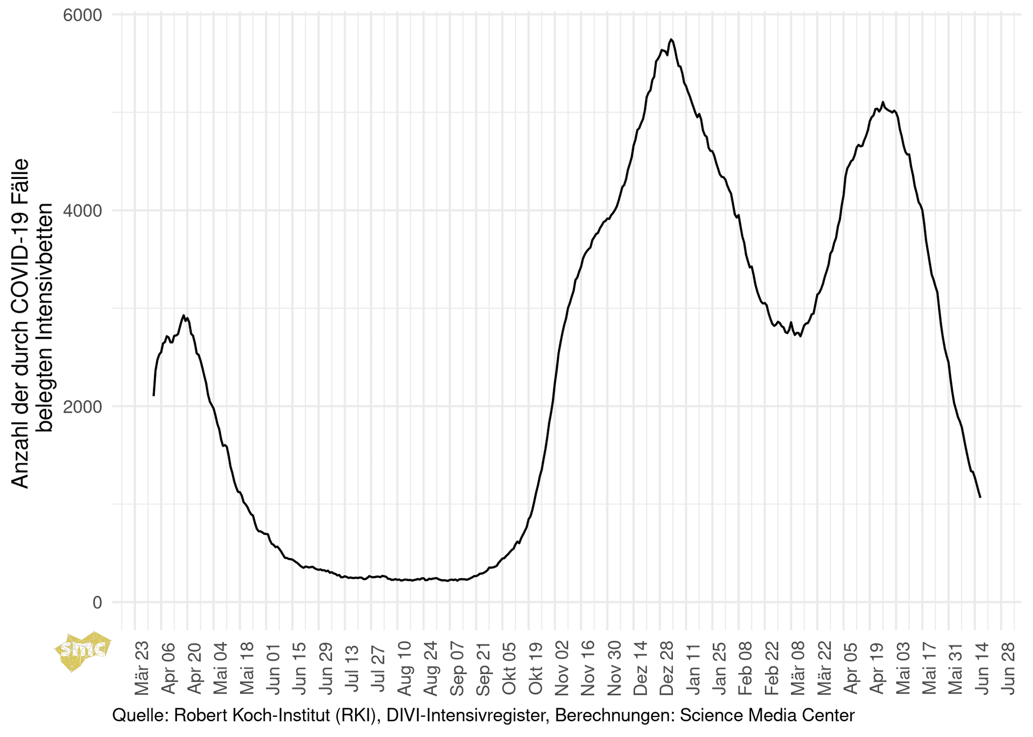Die Zahl der COVID-19-Fälle auf den Intensivstationen sinkt weiterhin. Durch die allgemein sinkenden Inzidenzen ist ein weiteres Sinken zu erwarten.