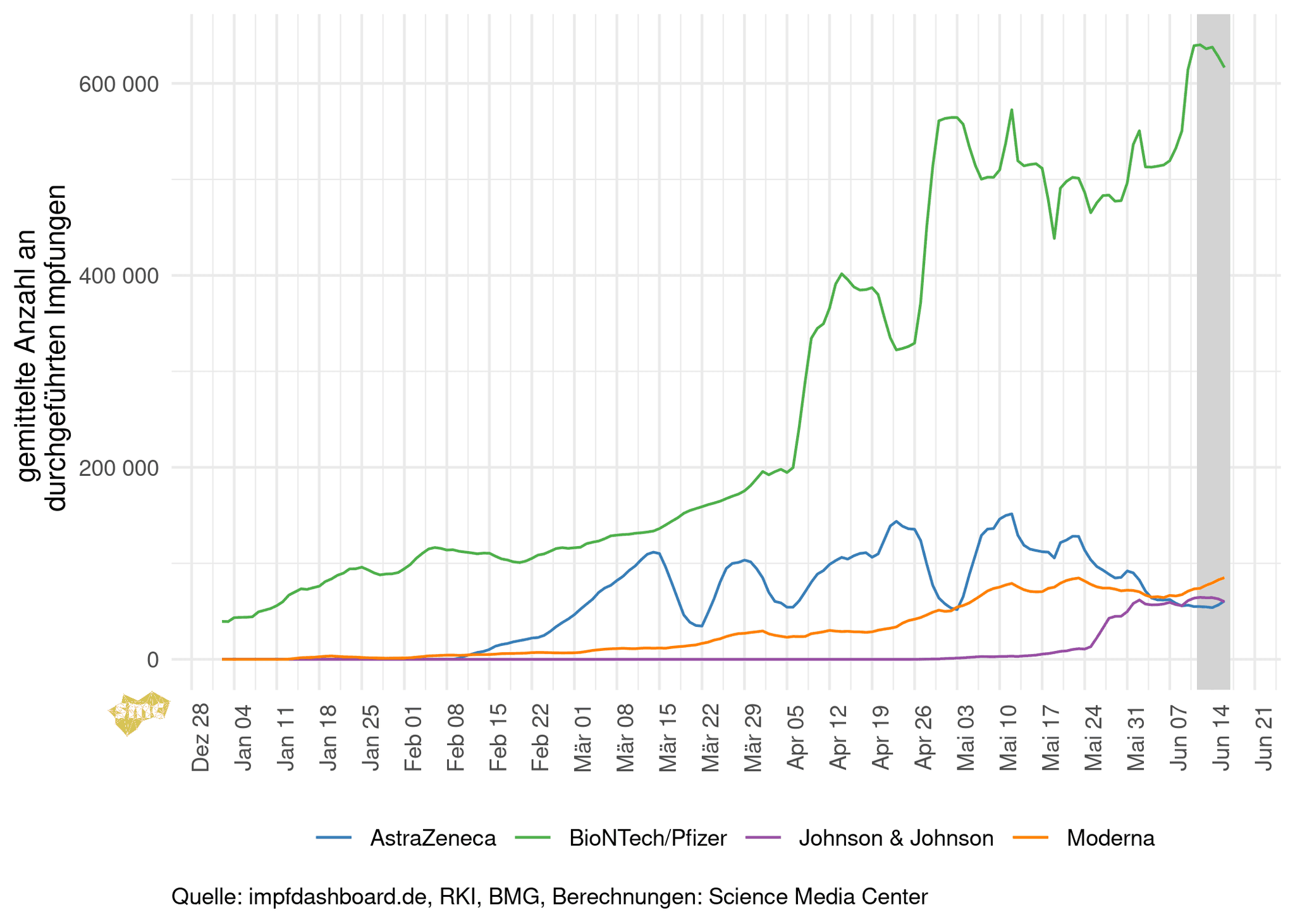 Eine Prognose der Impfquote anhand der angekündigten Liefermenge ist nicht ganz einfach aufzustellen: Je nach Impfstoff variiert die Zahl der Wochen bis zur Zweitimpfung. In der Vergangenheit wurden andere Intervalle empfohlen und in der Praxis wird schon einmal etwas davon abgewichen. Zusätzlich sind für AstraZeneca und Johnson & Johnson noch keine vollständigen Liefermengen bis Ende Juni bekannt.