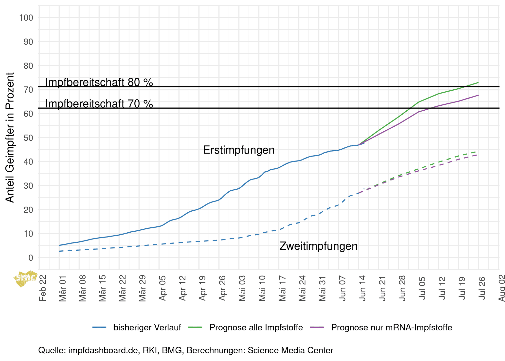 Die Prognose ist praktisch unverändert. Das Erreichen einer Erstimpfquote von über 60 Prozent bis Ende Juni scheint aber weiterhin erreichbar, wenn auch die Vektorimpfstoffe weiterhin genutzt werden.