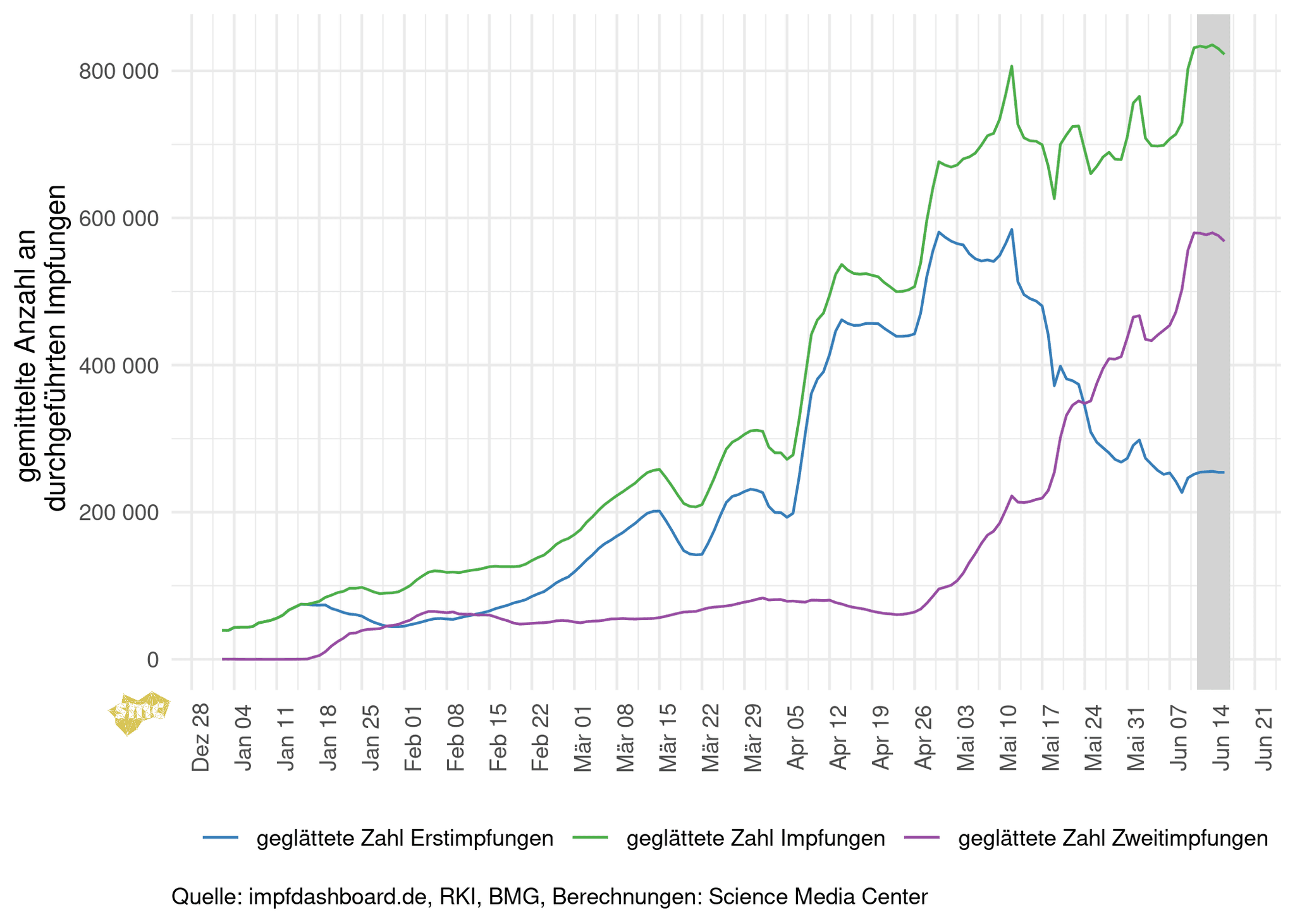 Da immer mehr Impfstoff verfügbar ist, kann sich auch das Impftempo beschleunigen. Die Grafik zeigt den über sieben Tage geglätteten Verlauf der täglichen Impfungen insgesamt und nach Erst- beziehungsweise Zweitimpfung getrennt. Durch die Feiertage im Mai und Juni schwanken die gemittelten Werte für die Impfungen noch.
