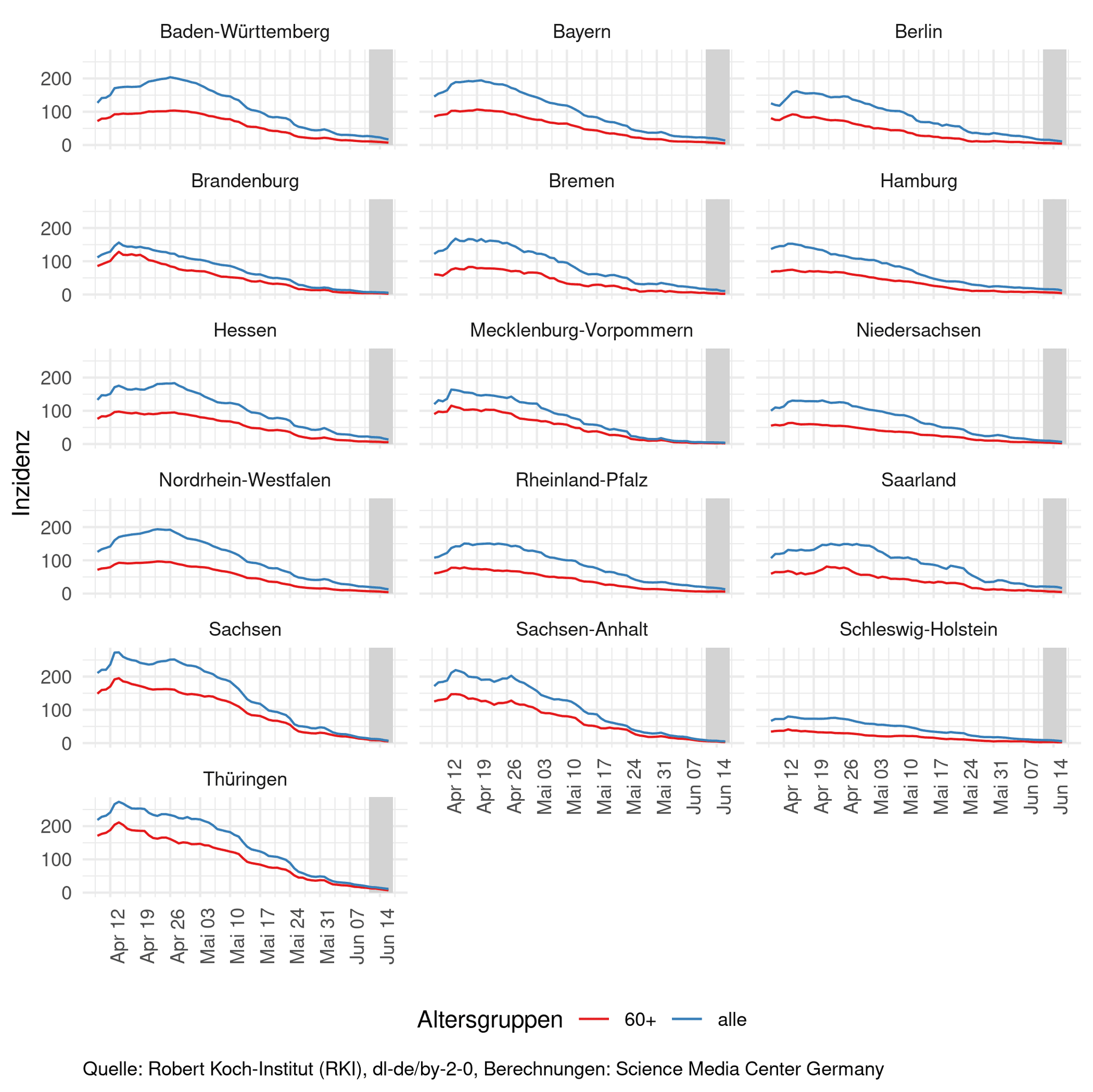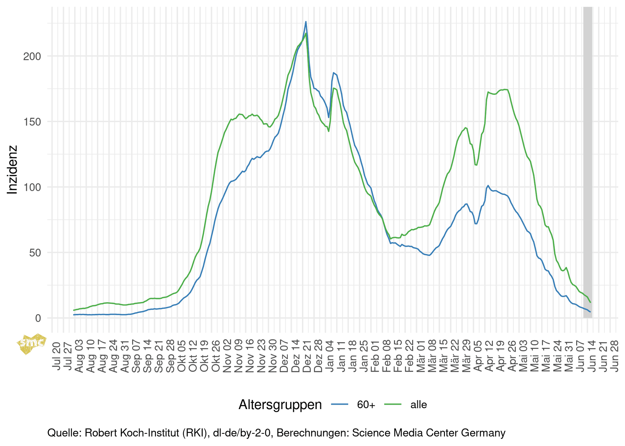 Die Grafik zeigt die Inzidenzen einmal für alle Altersgruppen und einmal ab 60 Jahren. Die Verzerrung durch die Feiertage im Mai und Juni betreffen nun nicht mehr die aktuellen Werte.