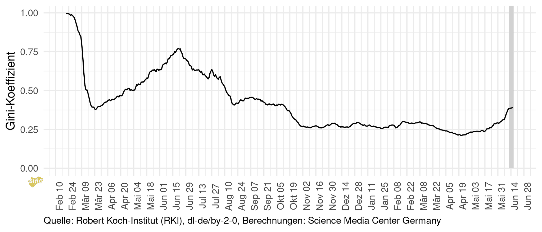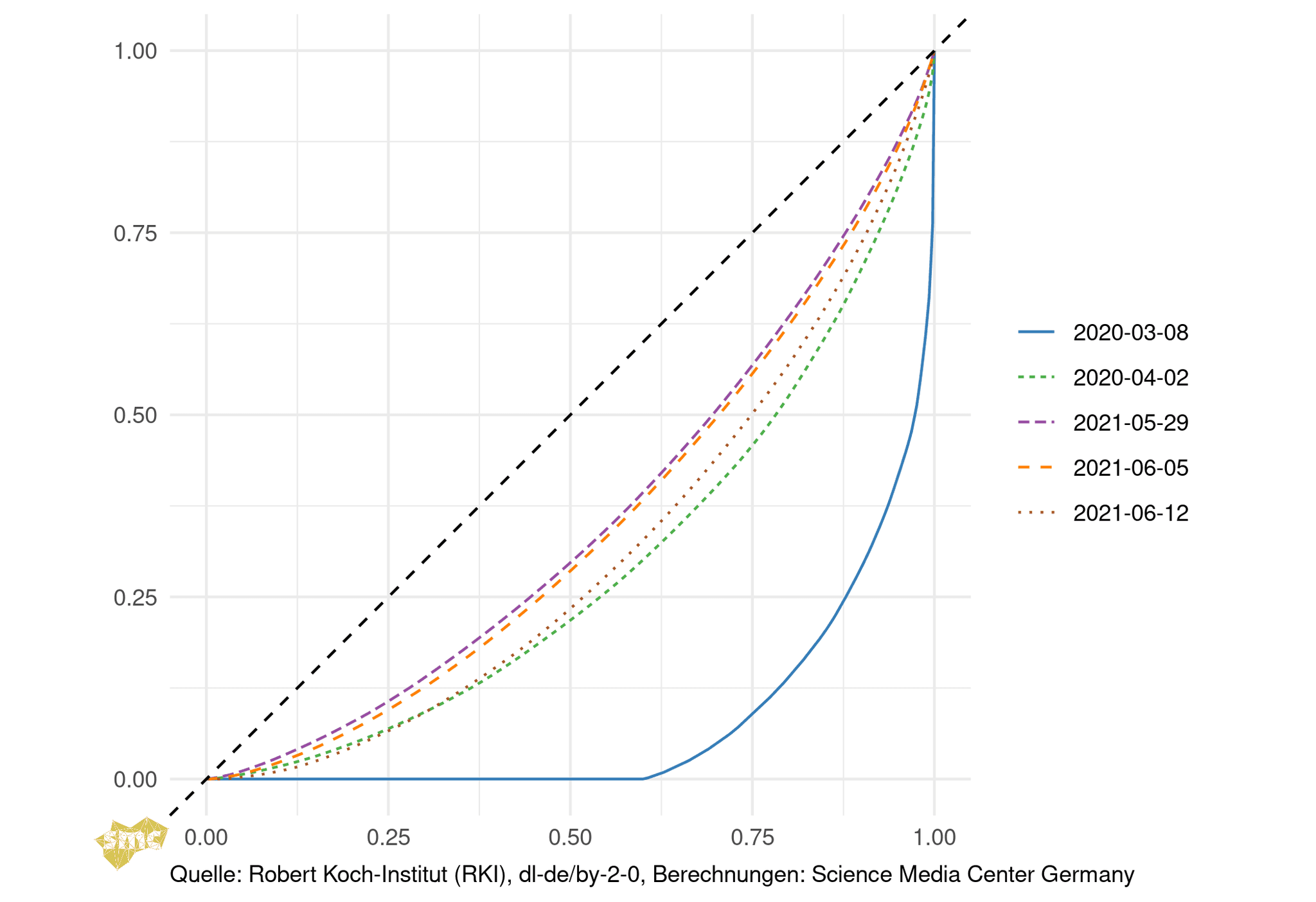 Ende Februar war die Ungleichheit bei den gemeldeten Fällen noch sehr groß, fiel dann aber mit steigender Fallzahl ab, da sich das Virus über Deutschland verteilte. Auch in den Hochzeiten waren die gemeldeten Inzidenzen nicht gleichmäßig verteilt.