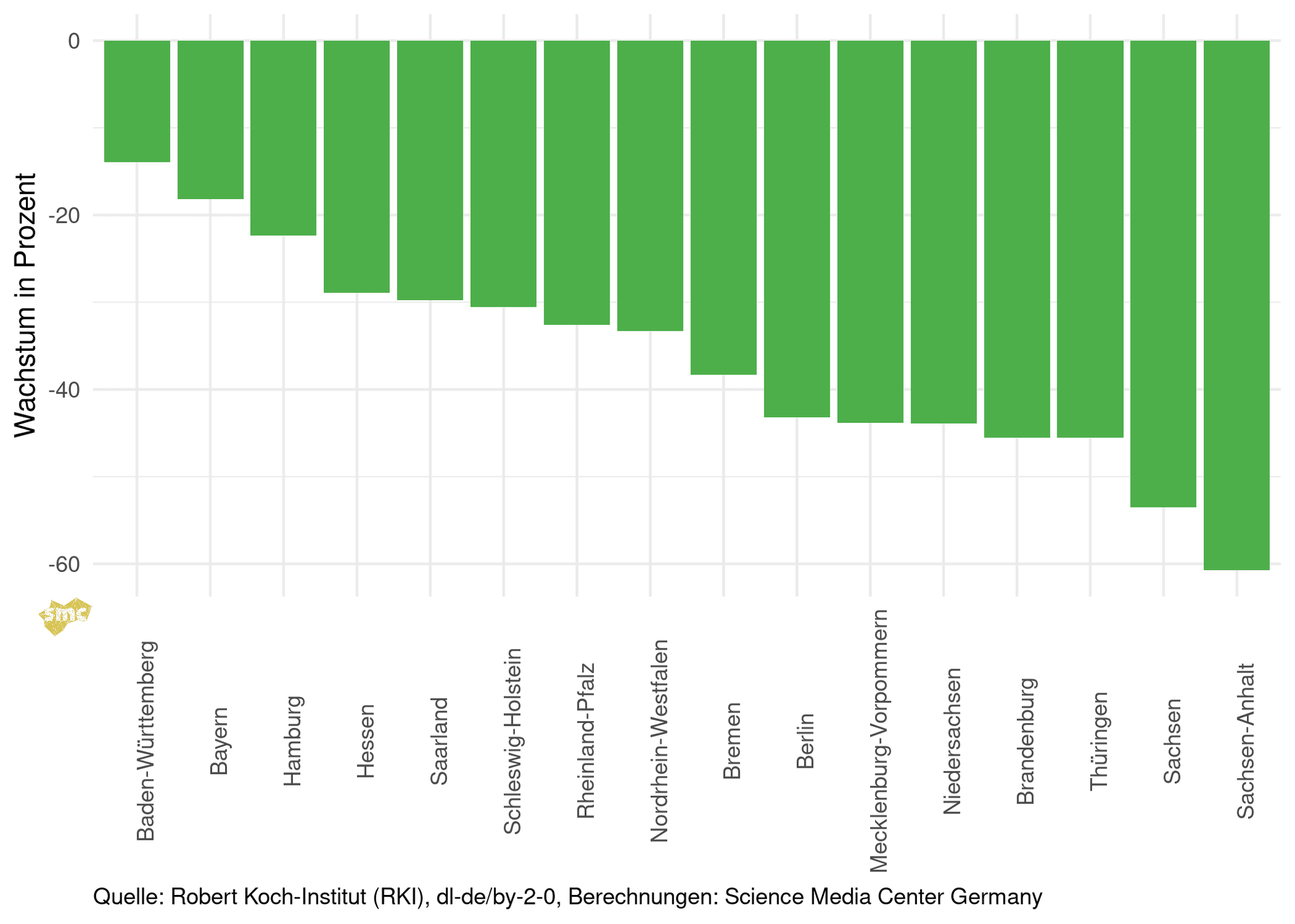 Im Folgenden wird das Wachstum der Inzidenz vom 12.06.2021 im Vergleich zur Vorwoche betrachtet. Die Inzidenzen sinken in allen Bundesländern.