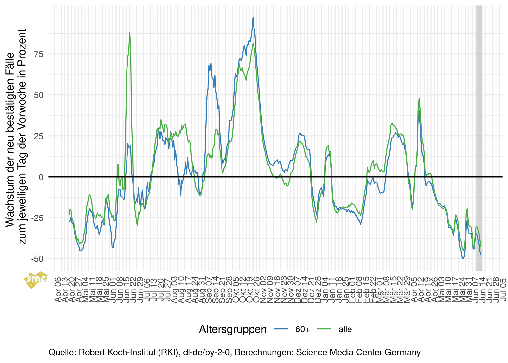 Die Grafik zeigt für jeden Tag das prozentuale Wachstum der geglätteten Fallzahlen im Vergleich zur Vorwoche. Dabei werden einmal alle gemeldeten Fälle berücksichtigt und einmal nur Fälle mit einem Alter von mindestens 60 Jahren. Der Rückgang der Inzidenzen hat sich etwas verlangsamt und wird jetzt nicht mehr durch die Feiertage verzerrt.
