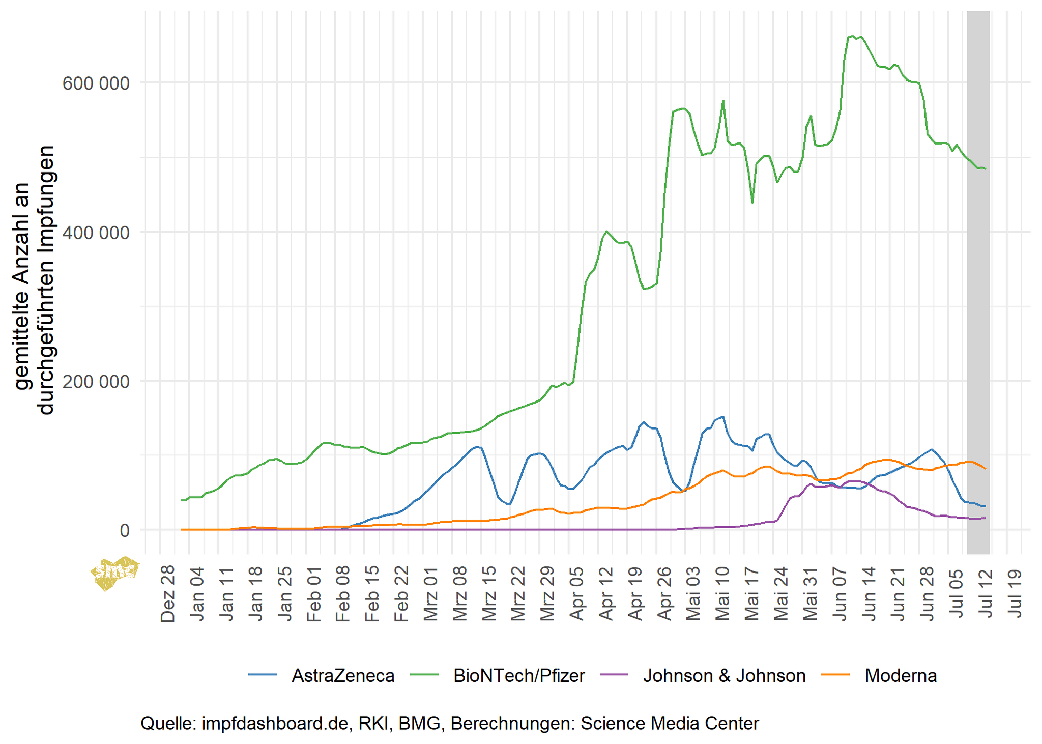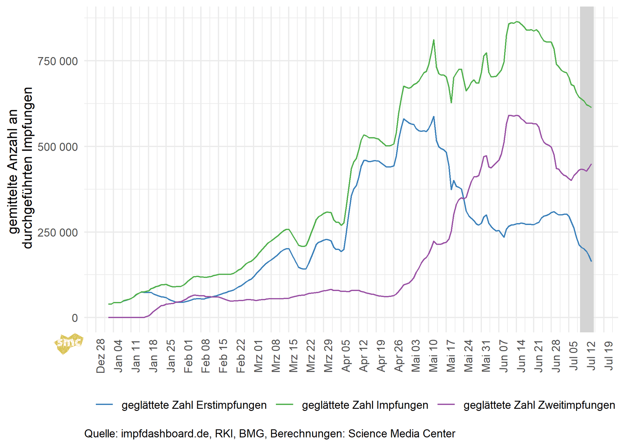 Der im Zuge der Umstellung der Impfstrategie aufgetretene Rückgang der Zahl der durchgeführten Zweitimpfungen ist gestoppt, die Zahlen steigen sogar wieder leicht. Die Zahl der durchgeführten Erstimpfungen hat sich aber in den vergangenen Wochen fast halbiert, was sich stark auf die Zweitimpfungen im August auswirken wird. Die Zahl der offenen Zweitimpfungen hat sich im Vergleich zur Vorwoche von etwa 14 auf 12 Millionen reduziert.