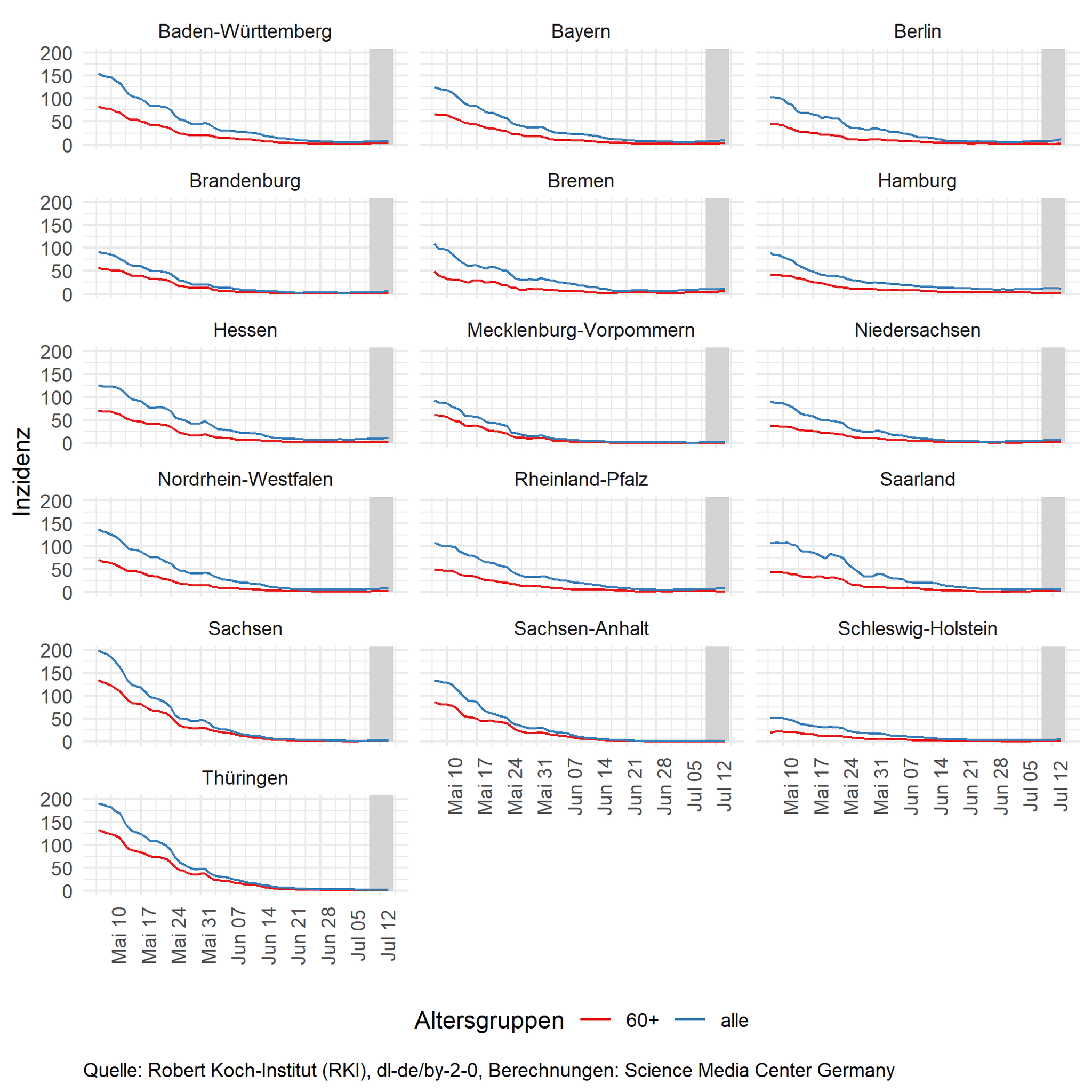 Die folgenden beiden Tabellen enthalten vier verschiedene Maßzahlen. Für den 12.07.2021 werden jeweils die für sieben Tage geglätteten Fallzahlen pro Tag und die Inzidenz angegeben. Darüber hinaus wird jeweils die Differenz der Maßzahl zu dem Wert vom 5.07.2021 angegeben, um eine Veränderung zur Vorwoche zu betrachten.