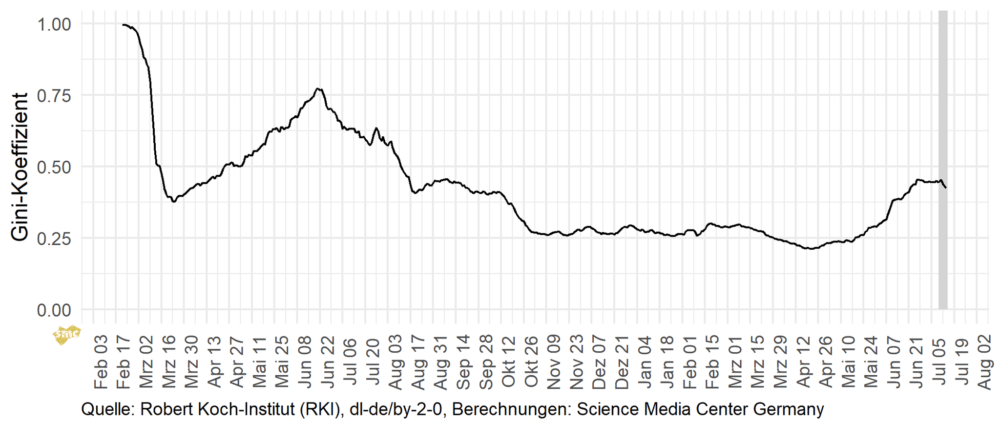 Ende Februar war die Ungleichheit bei den gemeldeten Fällen noch sehr groß, fiel dann aber mit steigender Fallzahl ab, da sich das Virus über Deutschland verteilte. Auch in den Hochzeiten waren die gemeldeten Inzidenzen nicht gleichmäßig verteilt.