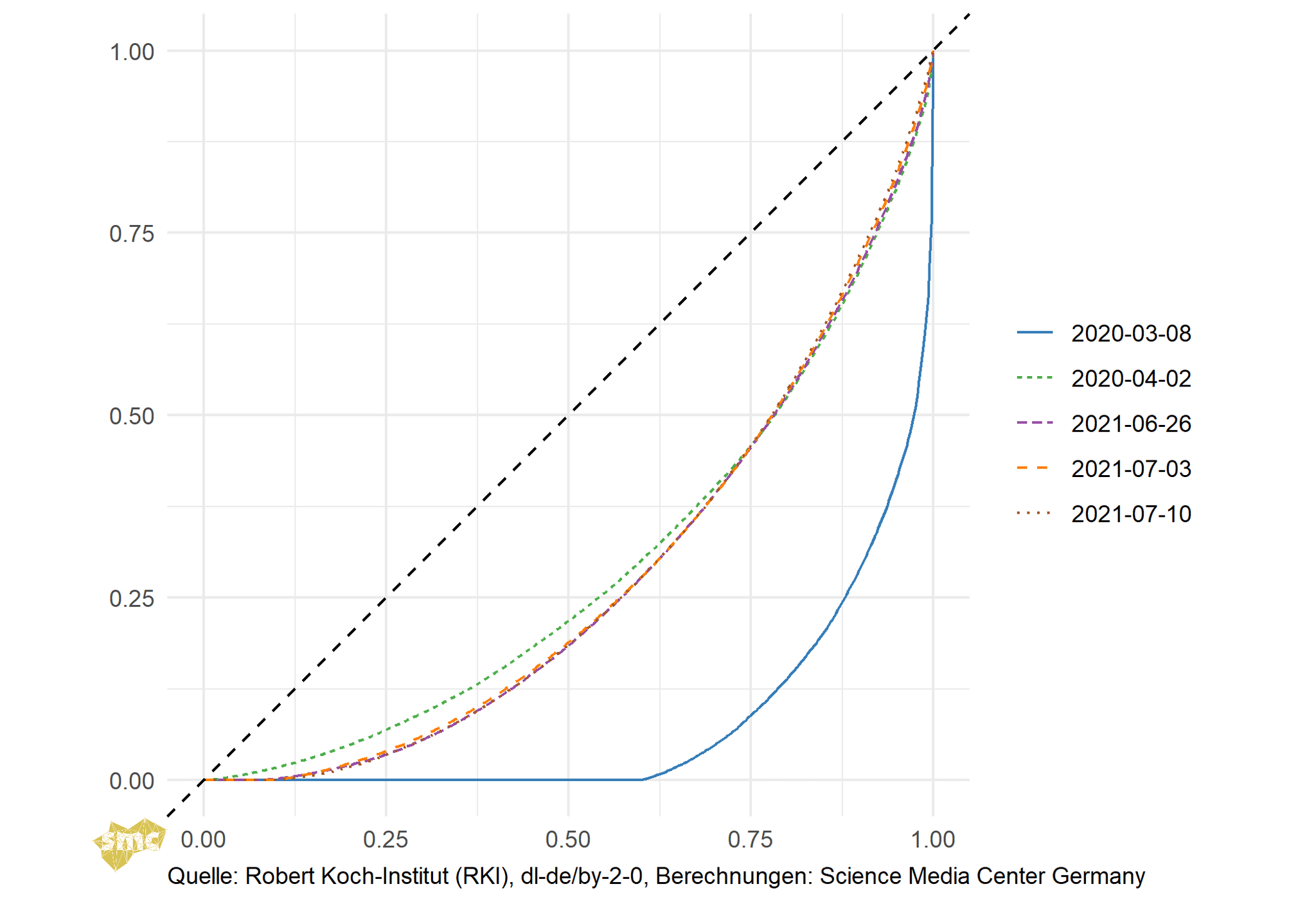 Neben der zeitlichen Betrachtung ist als Querschnitt auch eine Betrachtung der Verteilung in den Landkreisen zu einem bestimmten Zeitpunkt möglich. Die sogenannte Lorenzkurve zeigt, wie viel Prozent der Landkreise (X-Achse) wie viel Prozent der pro Landkreis aufsummierten Inzidenzen ausmachen. Dabei ist wichtig, dass es sich um diese relative Maßzahl handelt und nicht um die absolute, direkte Zahl der Infektionsfälle! München geht in diese Berechnung mit dem gleichen Gewicht ein wie Zweibrücken.