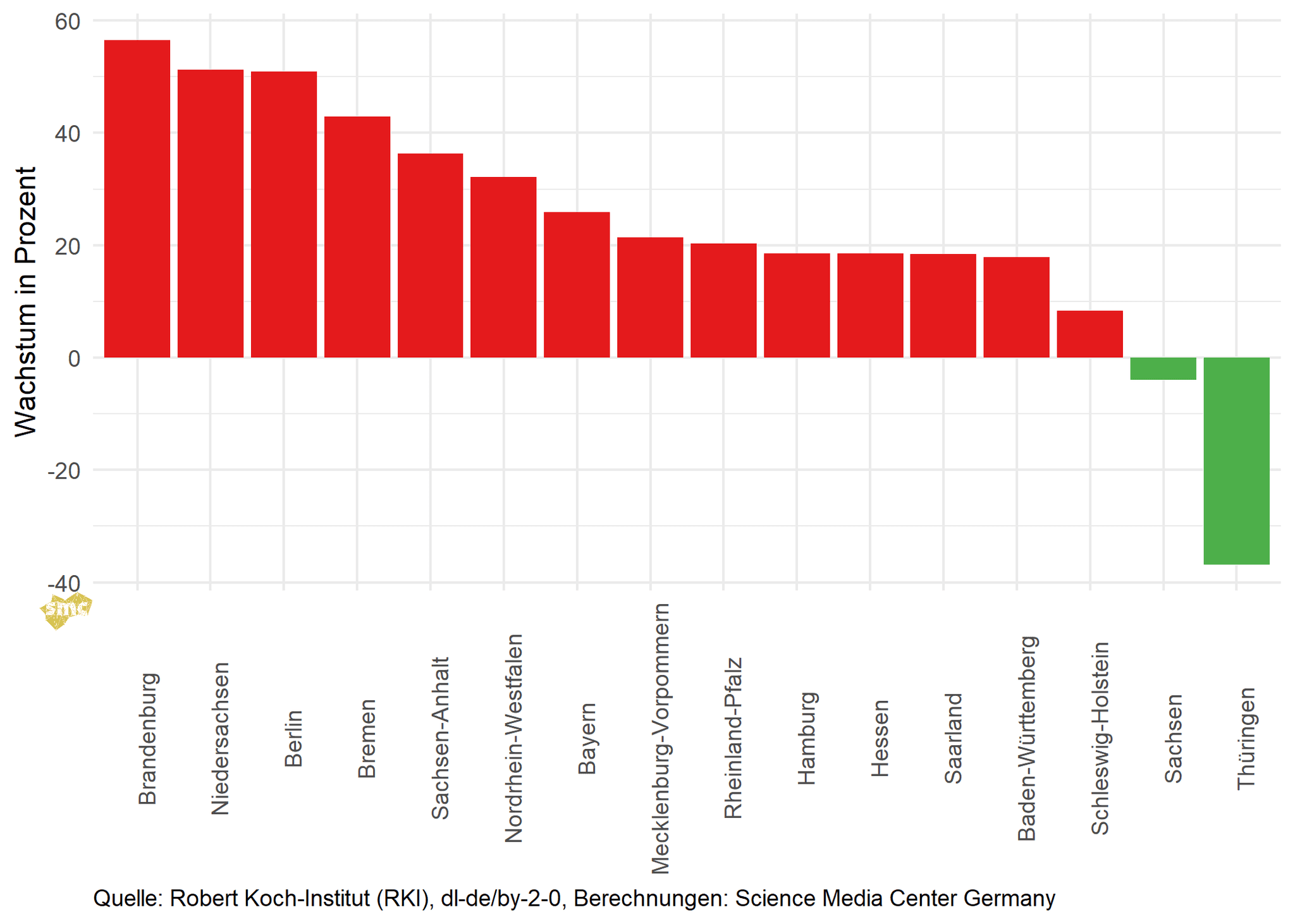 Im Folgenden wird das Wachstum der Inzidenz vom 10.07.2021 im Vergleich zur Vorwoche betrachtet. Mit Ausnahme von Sachsen und Thüringen steigen die Inzidenzen in allen Bundesländern.