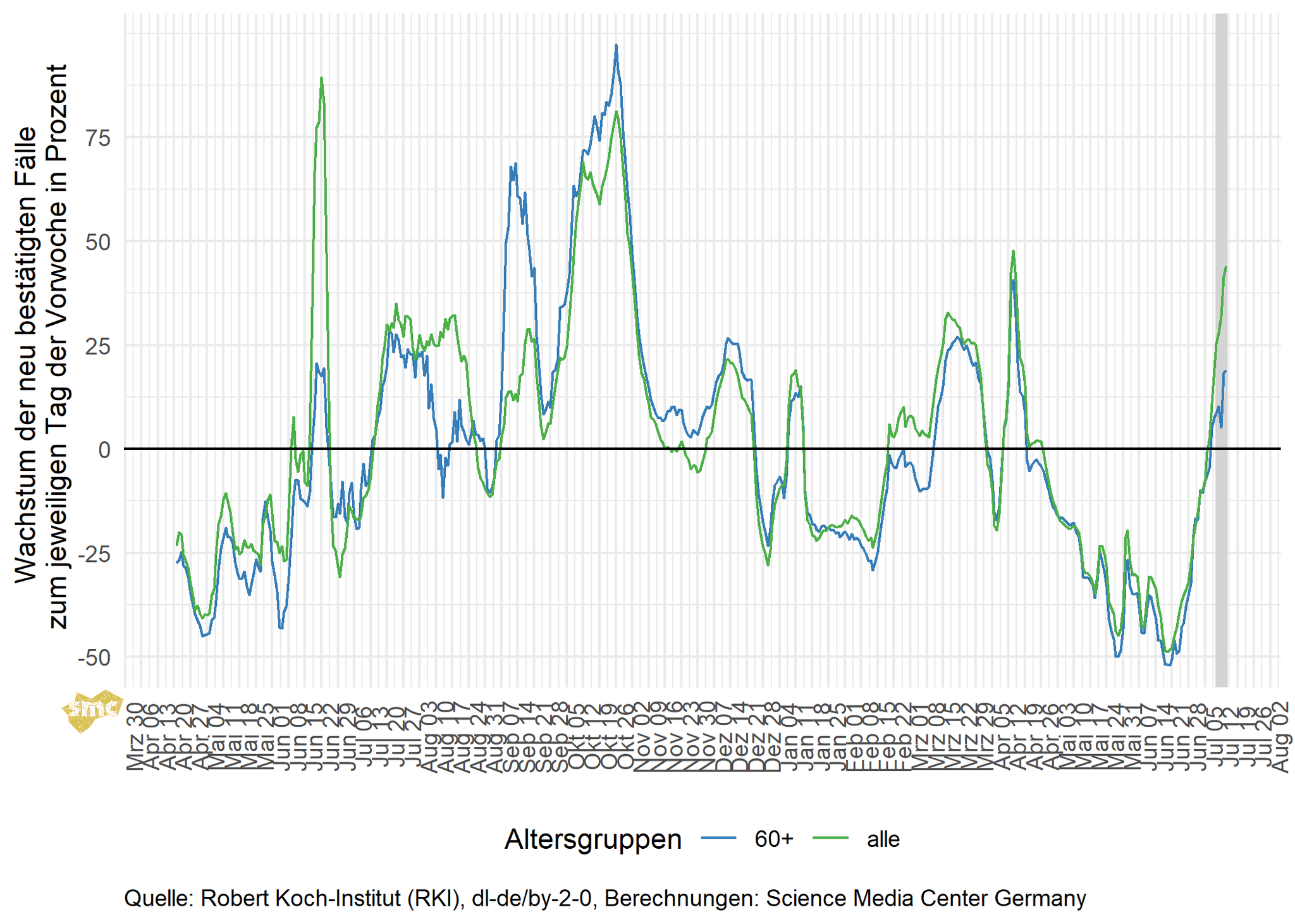 Die Grafik zeigt für jeden Tag das prozentuale Wachstum der geglätteten Fallzahlen im Vergleich zur Vorwoche. Dabei werden einmal alle gemeldeten Fälle berücksichtigt und einmal nur Fälle mit einem Alter von mindestens 60 Jahren. Das Wachstum steigt stark an. In der Altersgruppe ab 60 Jahren ist das Wachstum nicht ganz so stark, aber auch hier wird ein Wachstum der Fallzahlen verzeichnet.