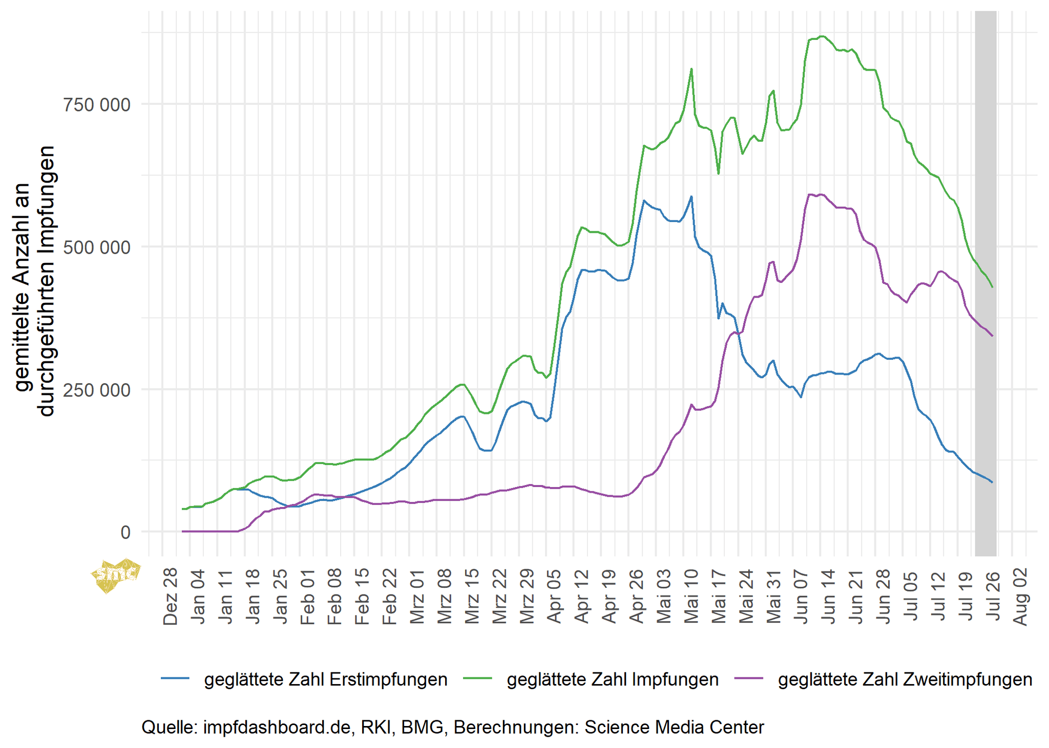 Die Grafik zeigt den über sieben Tage geglätteten Verlauf der täglichen Impfungen insgesamt und nach Erst- beziehungsweise Zweitimpfung getrennt. Die Zahl der durchgeführten Impfungen sinkt weiterhin.