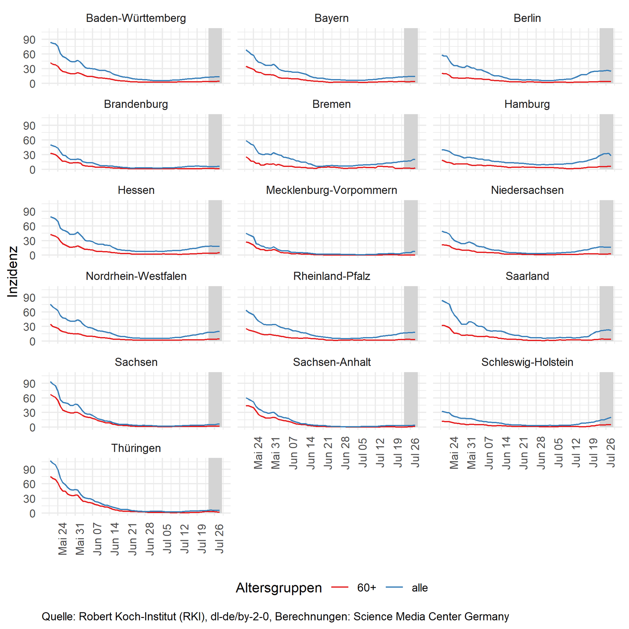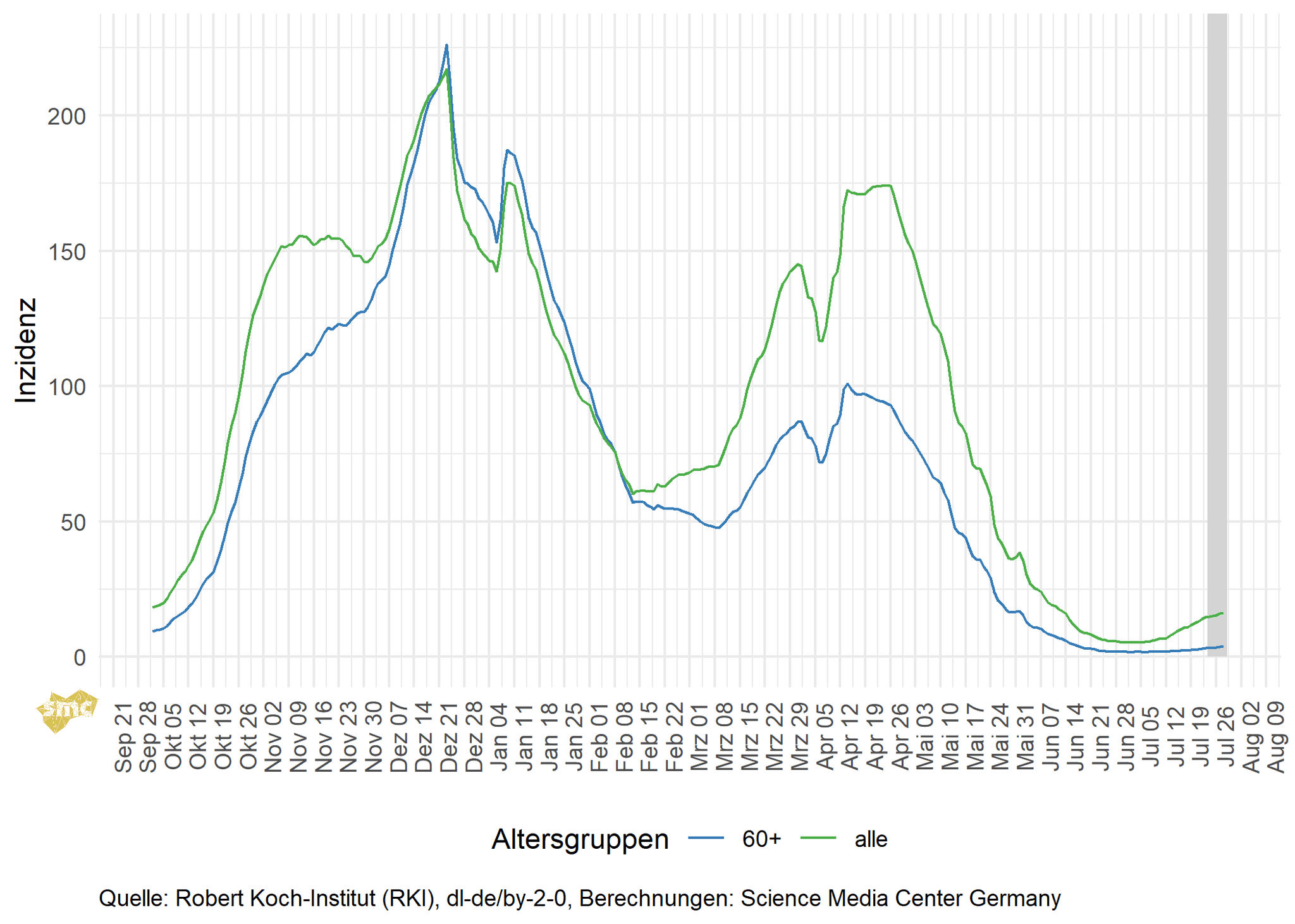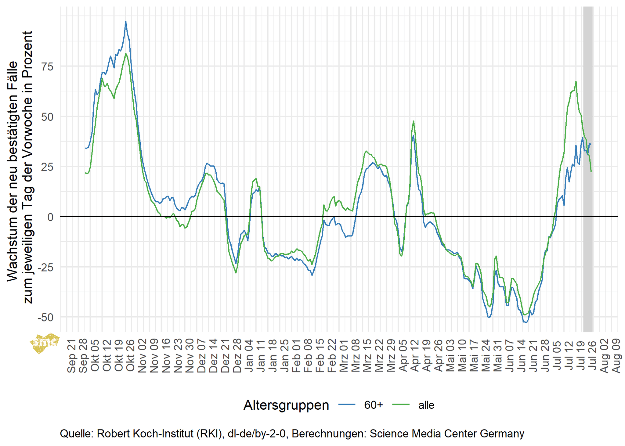 In Deutschland liegt das Inzidenzwachstum in den Altersgruppen ab 60 Jahren jetzt oberhalb des Wachstums der Inzidenz der Gesamtbevölkerung. Die Entwicklung der Inzidenzen in diesen Altersgruppen ist besonders wichtig für die Entwicklung der Situation in den Krankenhäusern.