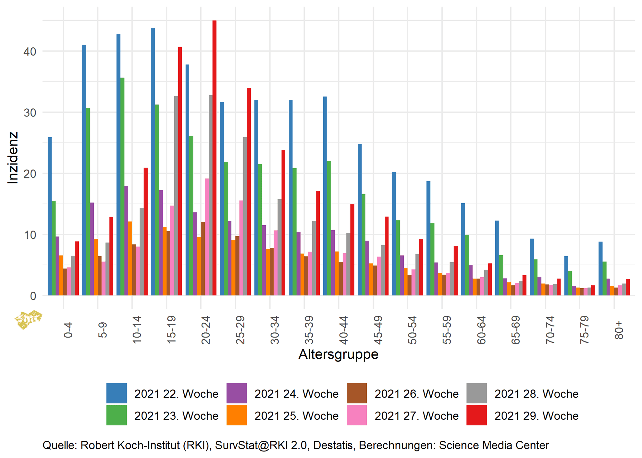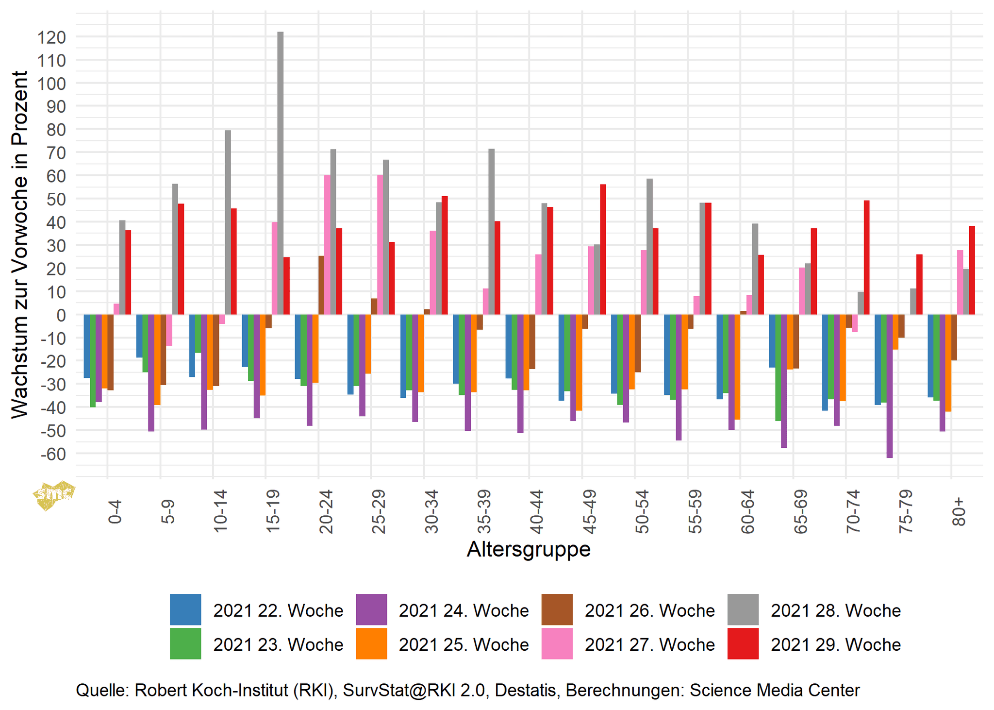 Alle Altersgruppen weisen ein Wachstum der Inzidenzen auf. Das höchste Wachstum ist inzwischen nicht mehr in den Altersgruppen zwischen 15 und 29 Jahren, auch in den oberen Altersgruppen hat das Wachstum zuletzt deutlich zugenommen. Die Altersgruppen zwischen 15 und 29 Jahren zeigen aber weiterhin die höchsten Inzidenzen auf.
