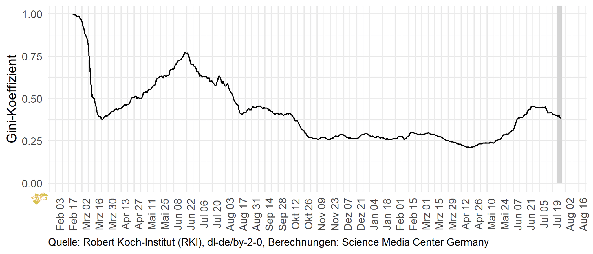 Ende Februar war die Ungleichheit bei den gemeldeten Fällen noch sehr groß, fiel dann aber mit steigender Fallzahl ab, da sich das Virus über Deutschland verteilte. Auch in den Hochzeiten waren die gemeldeten Inzidenzen nicht gleichmäßig verteilt.