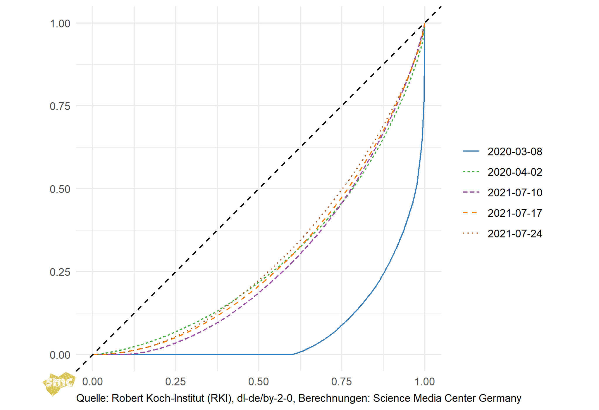 Neben der zeitlichen Betrachtung ist als Querschnitt auch eine Betrachtung der Verteilung in den Landkreisen zu einem bestimmten Zeitpunkt möglich. Die sogenannte Lorenzkurve zeigt, wie viel Prozent der Landkreise (X-Achse) wie viel Prozent der pro Landkreis aufsummierten Inzidenzen ausmachen. Dabei ist wichtig, dass es sich um diese relative Maßzahl handelt und nicht um die absolute, direkte Zahl der Infektionsfälle! München geht in diese Berechnung mit dem gleichen Gewicht ein wie Zweibrücken.
