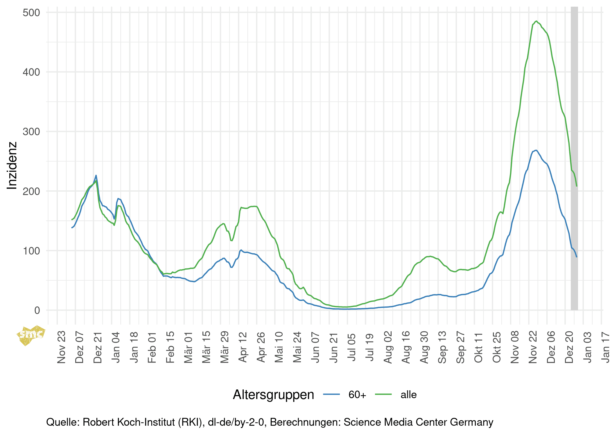 Die Grafik zeigt die Inzidenzen einmal für alle Altersgruppen und einmal ab 60 Jahren. Die Inzidenzen sind aufgrund der Feiertage aktuell nicht interpretierbar.
