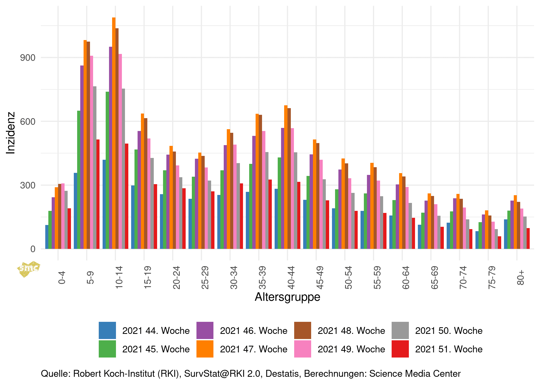 Die Inzidenz sinkt in allen Altersgruppen, ist aber durch die Feirtage stark unterschätzt.