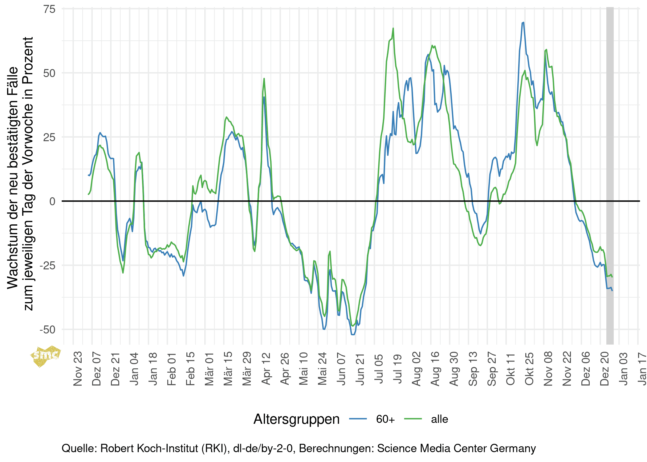 Die Grafik zeigt für jeden Tag das prozentuale Wachstum der geglätteten Fallzahlen im Vergleich zur Vorwoche. Dabei werden einmal alle gemeldeten Fälle berücksichtigt und einmal nur Fälle mit einem Alter von mindestens 60 Jahren. Das Negativwachstum ist aufgrund der Feiertage nicht interpretierbar.