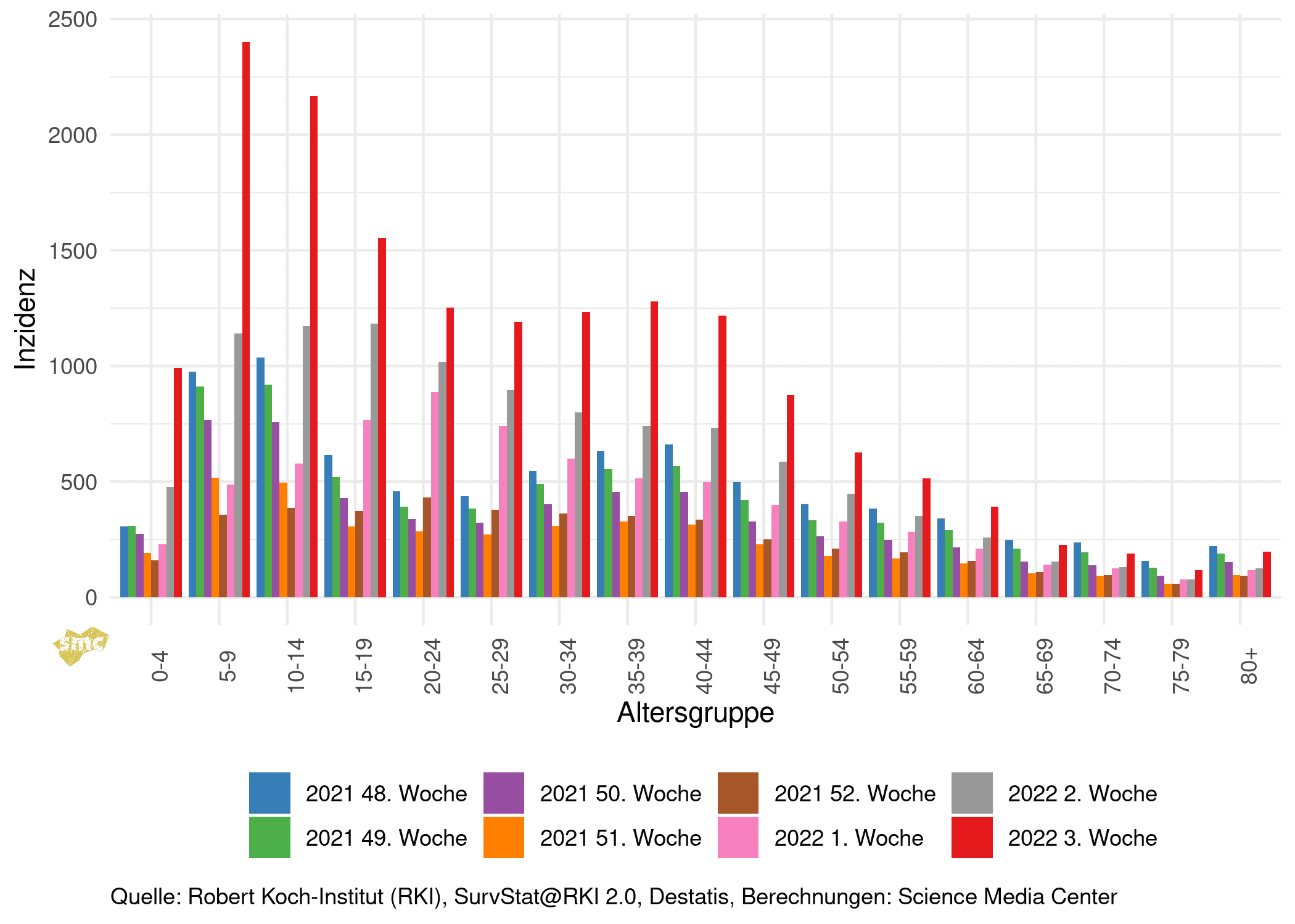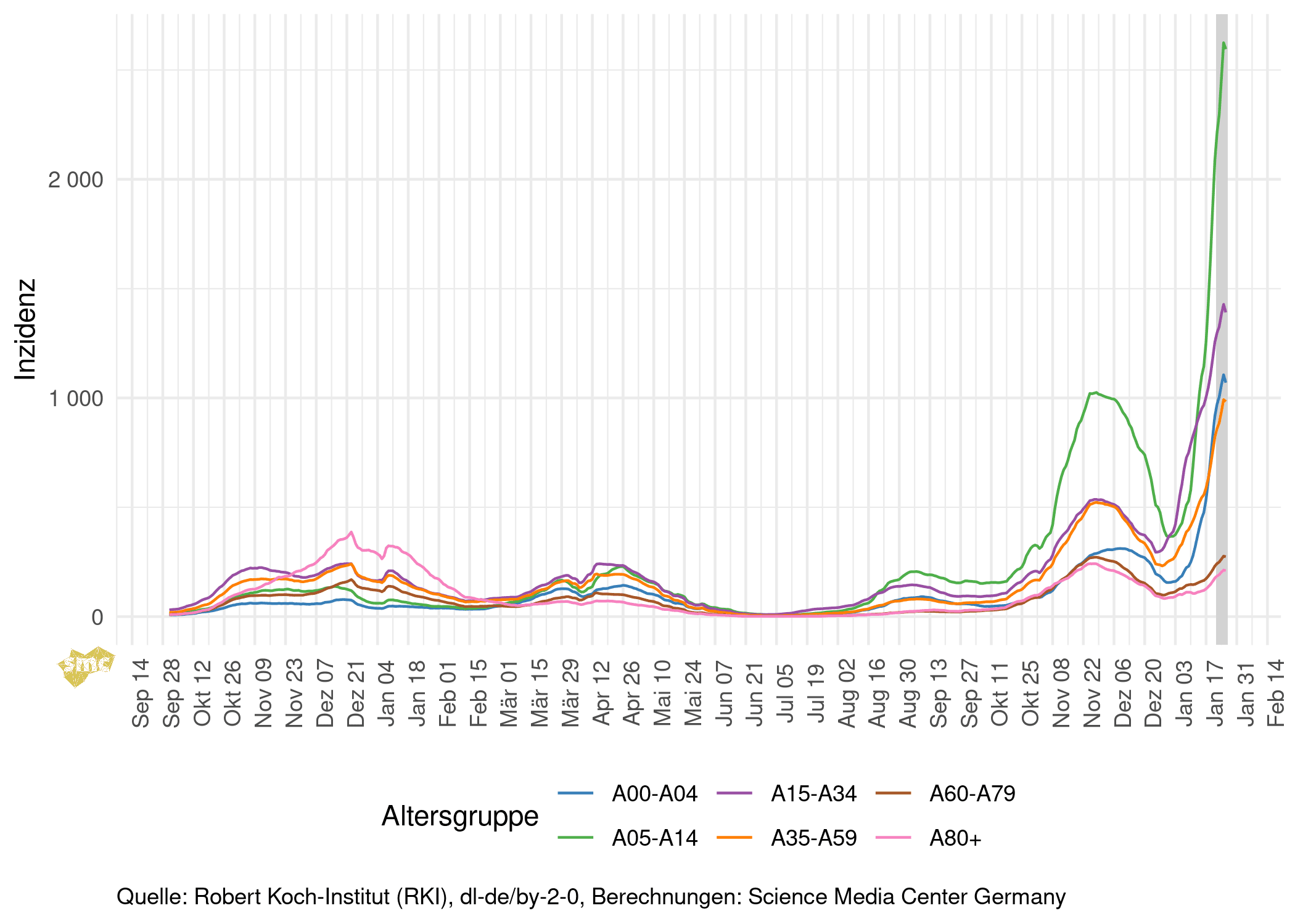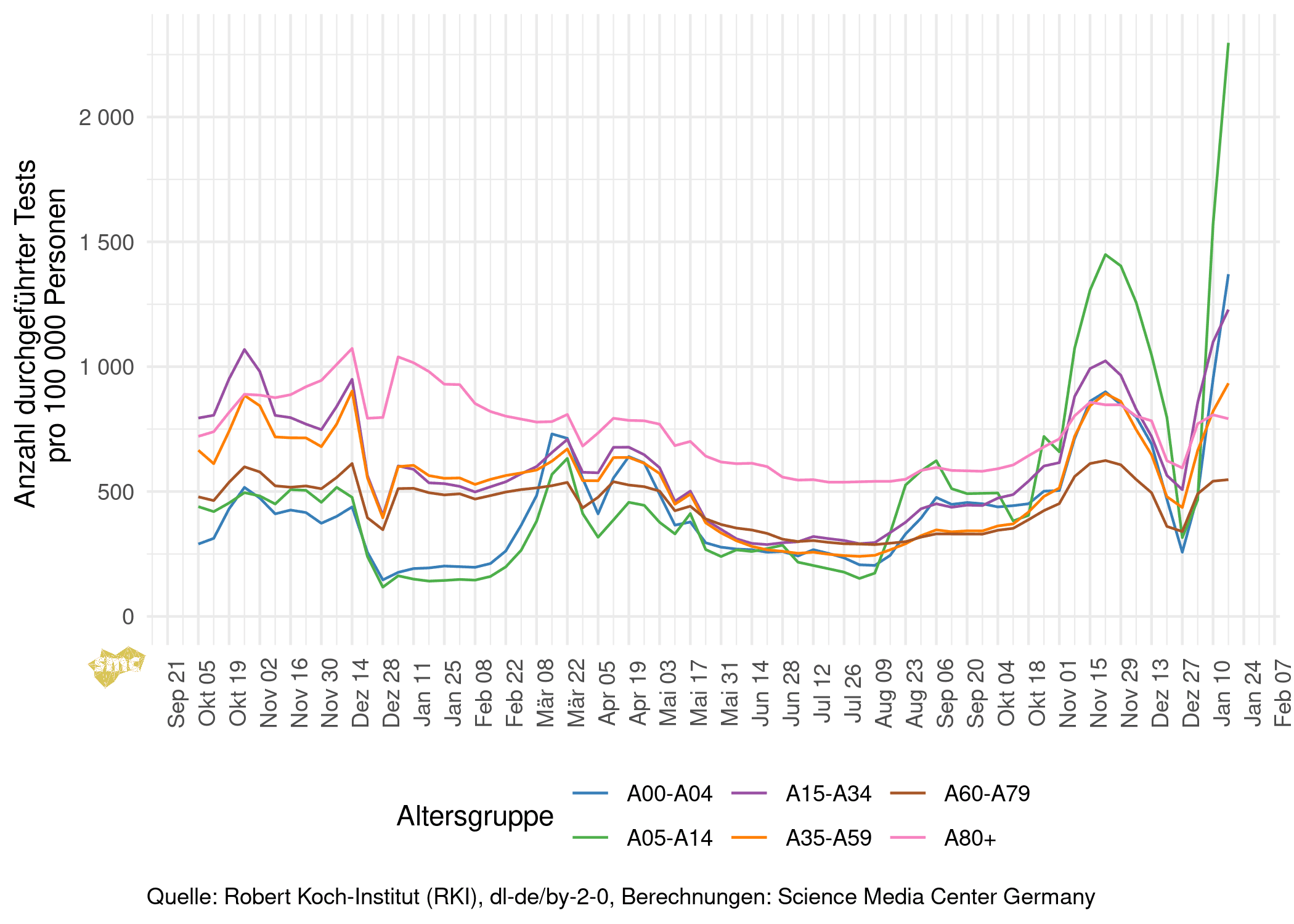 Bei den 5- bis 14-Jährigen liegt die Meldeinzidenz der vergangenen Woche deutlich oberhalb von 2000. Hier kann davon ausgegangen werden, dass die Dunkelziffer durch die Schultestungen zuletzt gesunken ist. Andersherum können insbesondere symptomlose Fälle insbesondere in den mettleren Altersgruppen übersehen werden, sodass ein direkter Inzidenzvergleich zwischen den Altersgruppen nicht möglich ist. Durch die geänderte Priorisierung bei den Testungen kann sich dieses Verhältnis in den kommenden Wochen weiter verschieben.