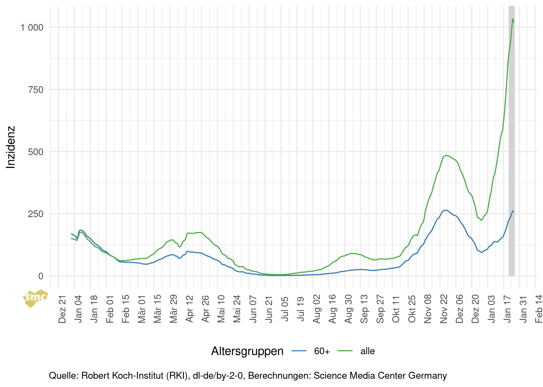 Auch wenn durch die oben geschilderten Einschränkungen die Dunkelziffer steigt, lassen sich anhand der Daten einige Abschätzungen treffen. Bei den 5- bis 14-Jährigen lag die Meldeinzidenz in der vergangenen Woche bei über 2000. Es haben sich also mindestens 2 Prozent der Personen in dieser Altersgruppe neu infiziert. Rechnet man die gemeldeten Infektionen der vergangenen 8 Wochen zusammen, kommt man bereits in die Nähe von 10 Prozent. Dazu kommt noch die allgemein wachsende Dunkelziffer und die Untererfassung zwischen den Jahren. Da wir wissen, dass Infektionswellen lange bevor alle Personen der Population in die Meldestatistik eingegangen sind brechen, wird deutlich, dass die Zahl der möglichen weiteren Verdopplungsschritte begrenzt ist: Ein Wachstum von 50 Prozent pro Woche (in den vergangenen Wochen wurden höhere Wachstumsraten beobachtet, die aber zum Teil auch auf die Schulferien zurückzuführen sind), würde noch im Februar dazu führen, dass mehr als die Hälfte der Altersgruppe infiziert werden würde. Eine Verlangsamung des Wachstums und dann auch ein Erreichen des Peaks in der ersten Februarhälfte scheint so wahrscheinlich. Ein Blick in das Vereinigte Königreich zeigt, dass auch nach der Omicron-Welle weiterhin eine im historischen Vergleich hohe Inzidenz herrschen kann. Dort liegt die Inzidenz gerade bei über 900, während die Zahl der Krankenhausaufnahmen sinkt.