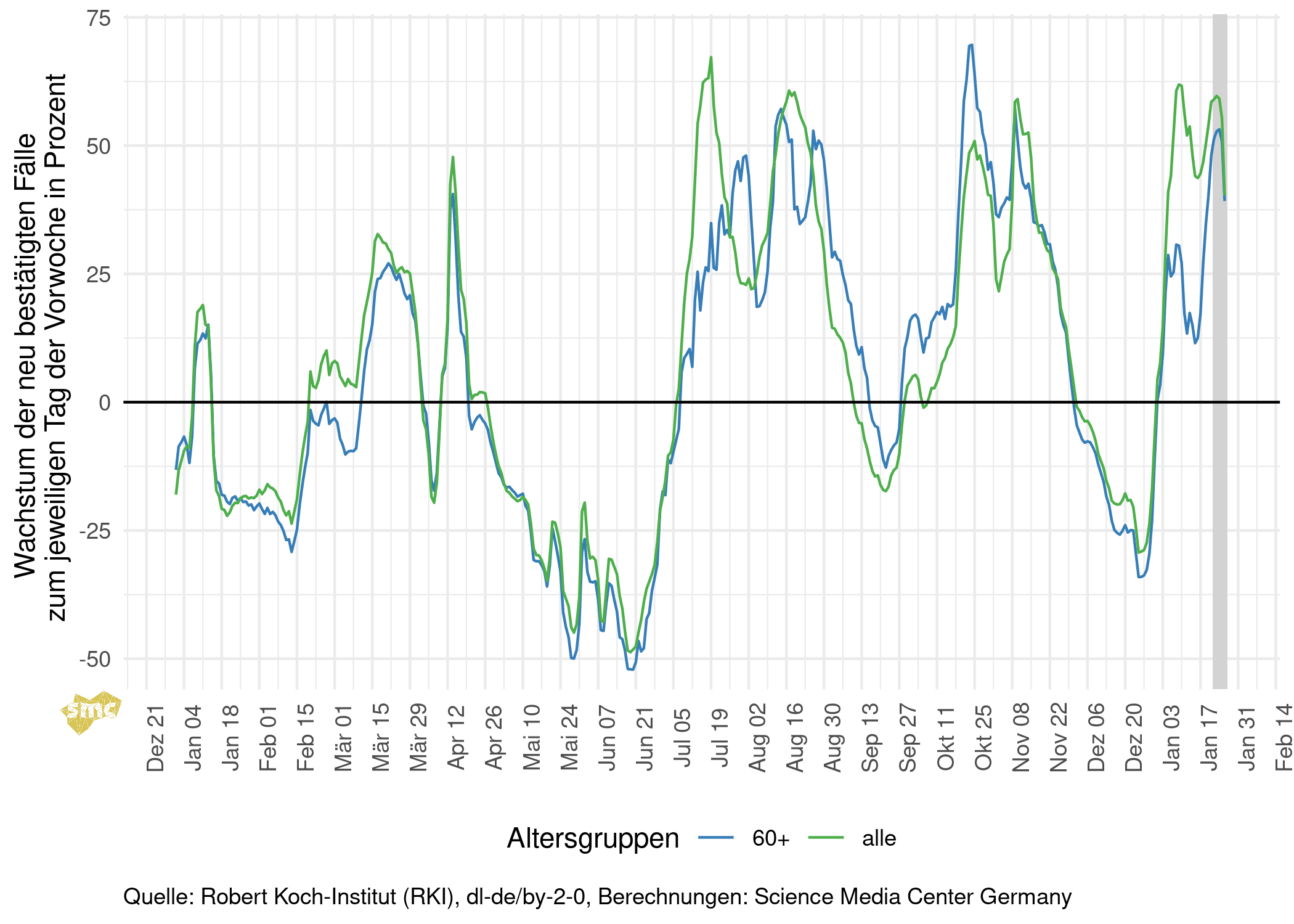 Die Grafik zeigt für jeden Tag das prozentuale Wachstum der geglätteten Fallzahlen im Vergleich zur Vorwoche. Dabei werden einmal alle gemeldeten Fälle berücksichtigt und einmal nur Fälle mit einem Alter von mindestens 60 Jahren. Das Wachstum ist weiterhin hoch.