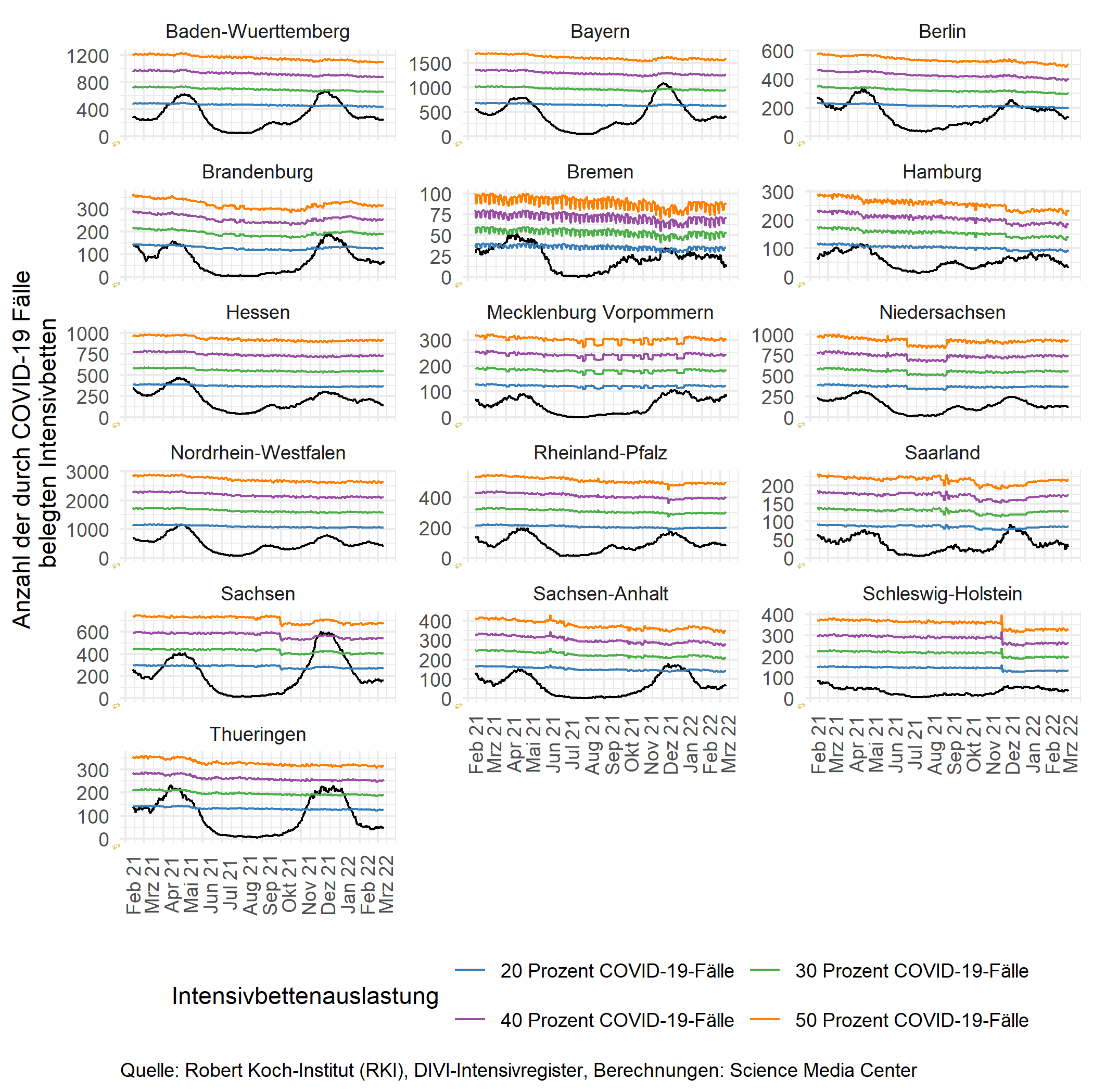 Schaut man sich nach Bundesländern an, wie die Intensivstationen ausgelastet sind, lag im vergangenen Winter das jeweilige Maximum auf einem anderen relativen Niveau. Während Berlin und Sachsen in der Spitze eine Auslastung von etwa 40 Prozent erreichten, waren in Schleswig-Holstein nicht einmal 20 Prozent der gemeldeten Intensivbetten mit COVID-19-Fällen belegt. Die relative Grenze schwankt dabei über die Zeit, da nicht an jedem Tag gleich viele verfügbare Betten gemeldet werden. Um die relative Belastung vergleichen zu können, werden auf der Y-Achse unterschiedliche absolute Skalen verwendet. In allen Bundesländern liegt die durch COVID-19-Fälle verursachte Auslastung der Intensivbetten unter 20 Prozent.