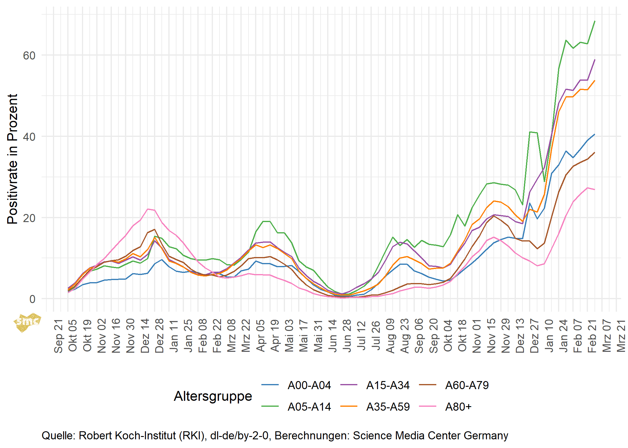 Die Testpositivrate steigt in fast allen Altersgruppen, was auf eine steigende Dunkelziffer in der gesamten Bevölkerung hindeutet. Nur in der Altersgruppe ab 80 Jahren ist die Testpositivrate zuletzt minimal gesunken.