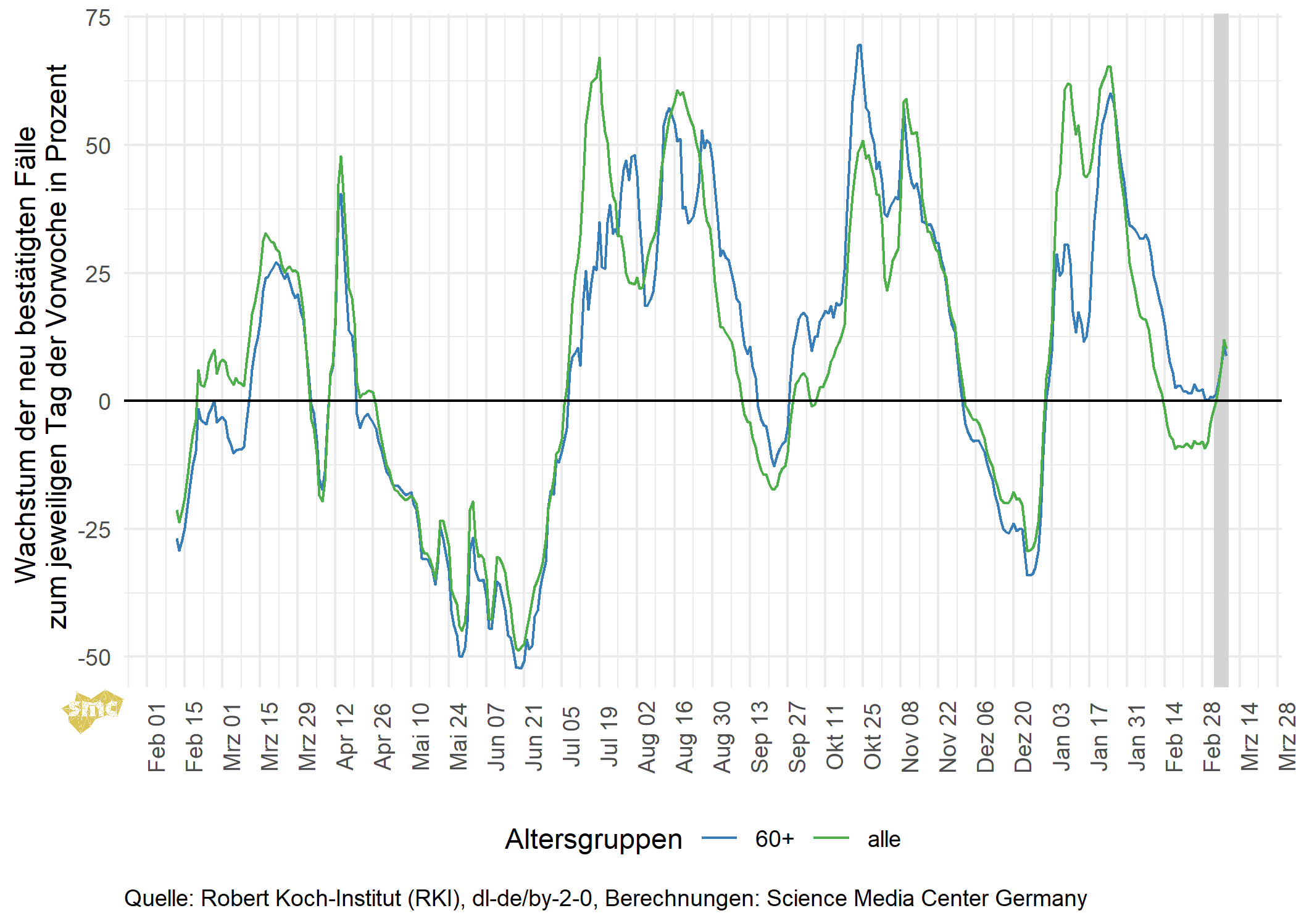 Die Grafik zeigt für jeden Tag das prozentuale Wachstum der geglätteten Fallzahlen im Vergleich zur Vorwoche. Dabei werden einmal alle gemeldeten Fälle berücksichtigt und einmal nur Fälle mit einem Alter von mindestens 60 Jahren. Das Wachstum in der Altersgruppe ab 60 Jahren und das Gesamtwachstum steigen aktuell gleichzeitig.