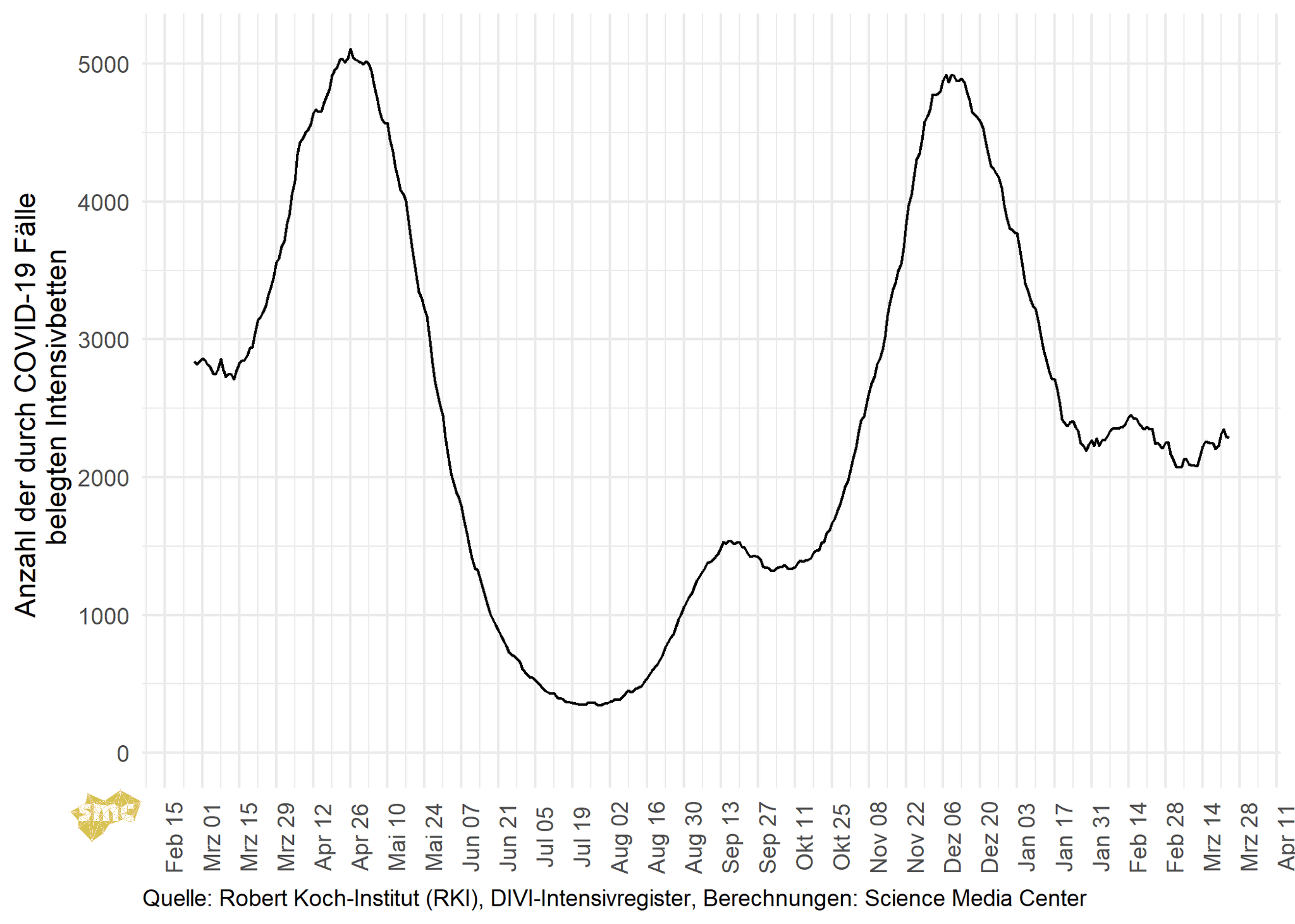 Die Zahl der COVID-19-Fälle auf den Intensivstationen liegt bisher in diesem Jahr auf gleichem Niveau, zuletzt gab es wieder einen Anstieg, insgesamt bleibt das Niveau aber stabil.