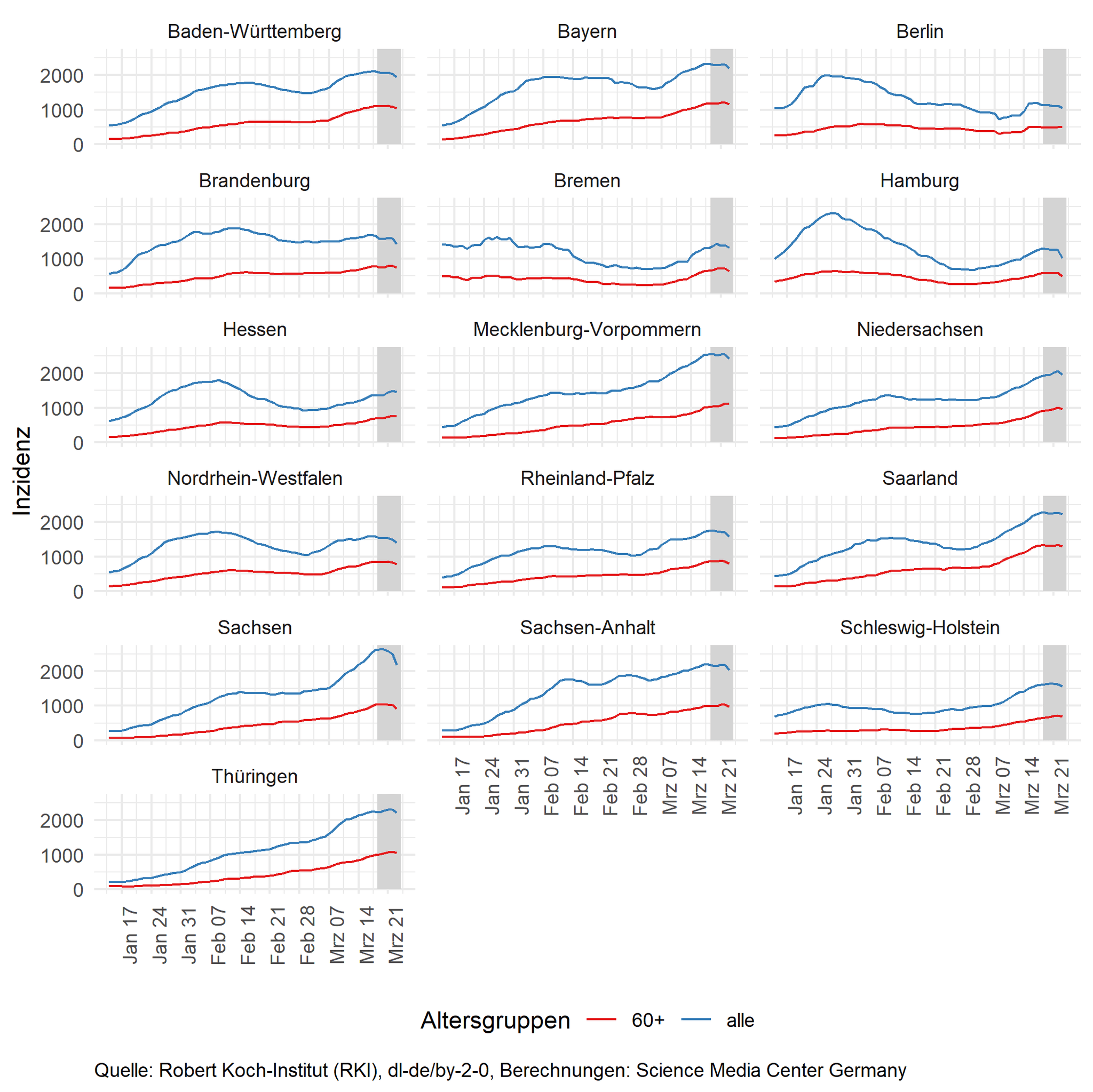 Die Inzidenzen steigen in allen Altersgruppen. Das höchste Wachstum verzeichnen die oberen Altersgruppen.