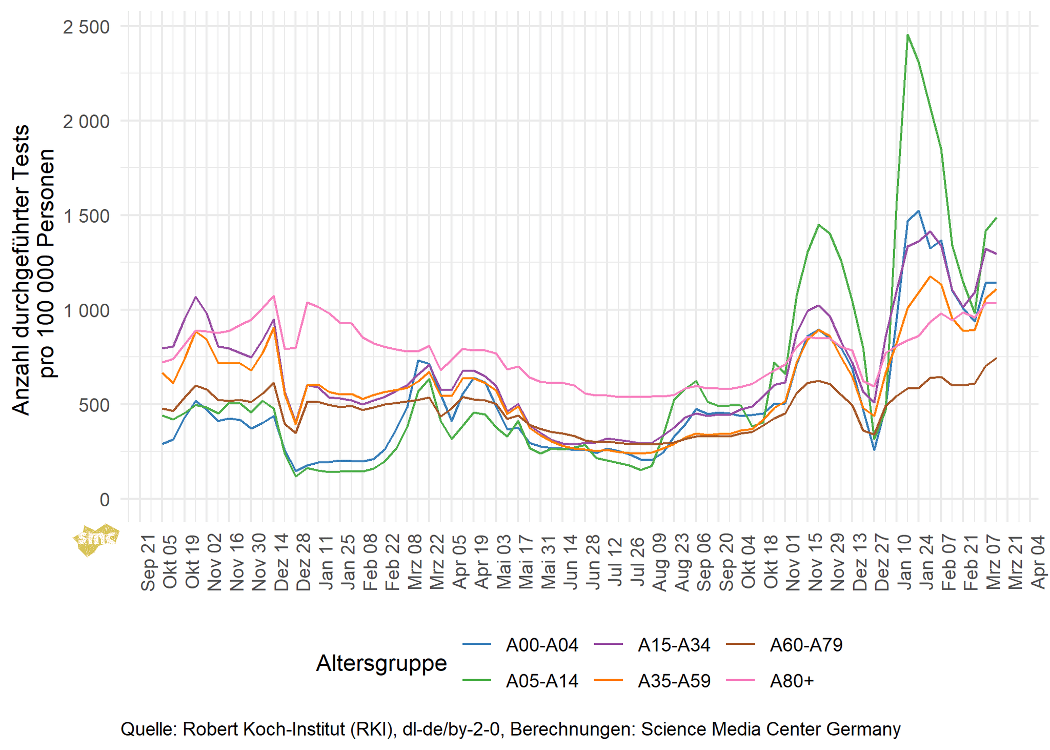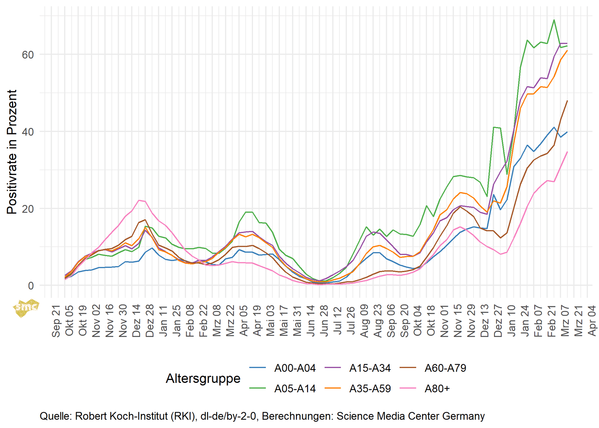 Die Testpositivrate steigt in den Altersgruppen ab 35 Jahren, darunter stagniert sie.